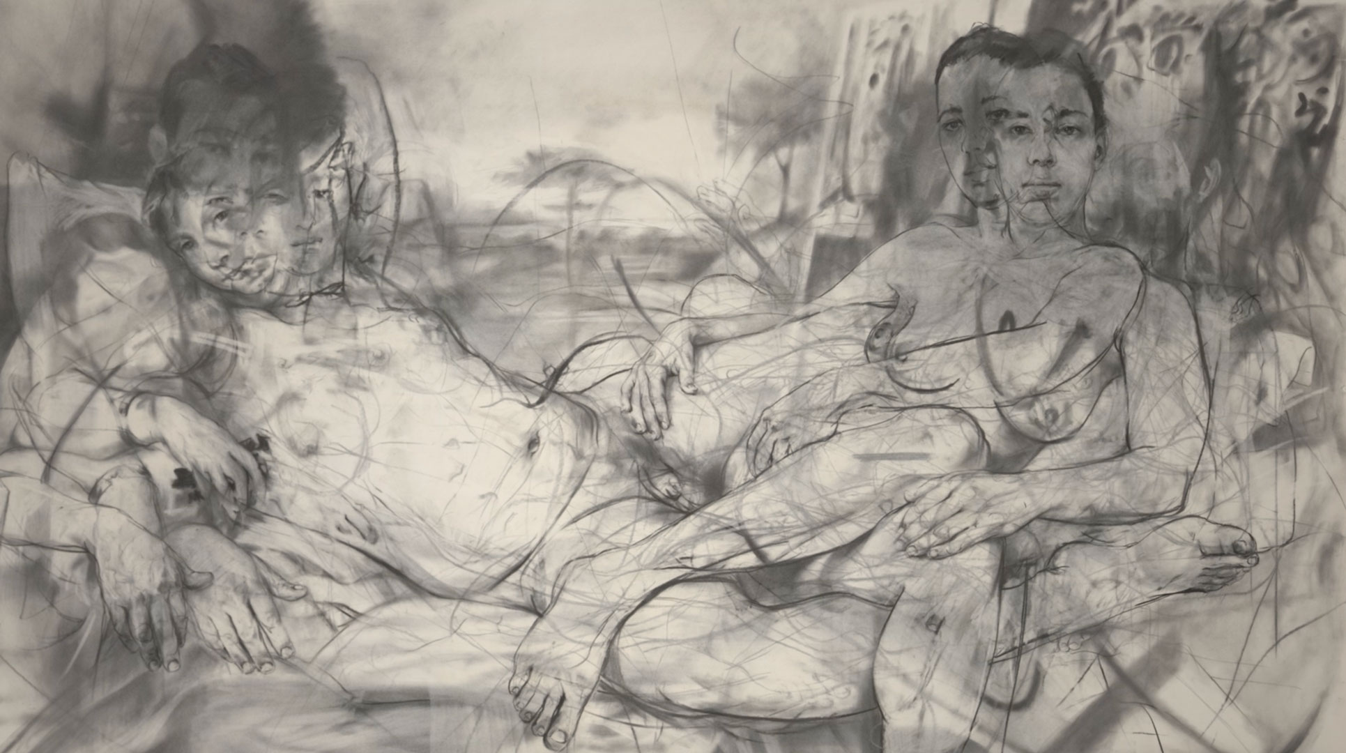 Jenny Saville’s Mirror (2011–12) is a monumental charcoal drawing that redefines one of the most iconic motifs in art history: the reclining nude. Stretching more than eight feet wide, the work fuses multiple intertwined figures in a densely layered composition that nods to both Old Master painting and modernist innovation.