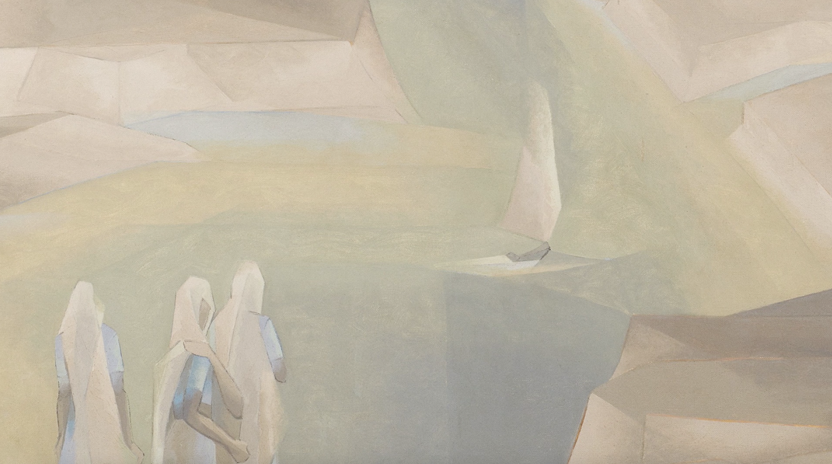 Before a hushed expanse of cliffs, sea and sky stand three hooded wanderers. Beneath them plunges a serpentine ravine, extending to a distant horizon. The figures are alone in the scene but for three sailing ships which punctuate the still waters below. A t.mes