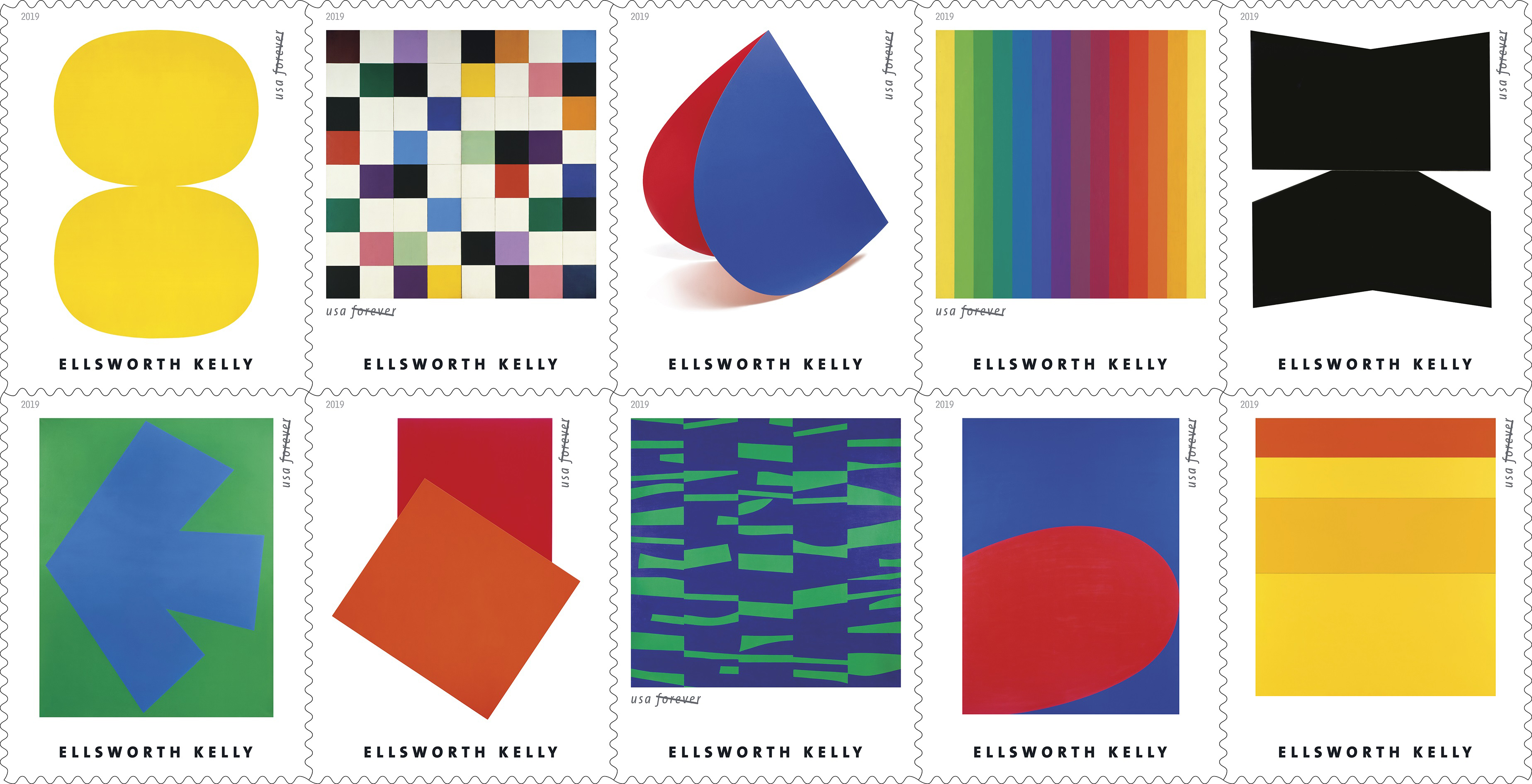 – and today, four years after the artist’s death, Kelly’s legacy shows no sign of waning. Further proof: last month, the U.S. Postal Service announced that 10 of the artist’s greatest works will be commemorated as Forever Stamps.