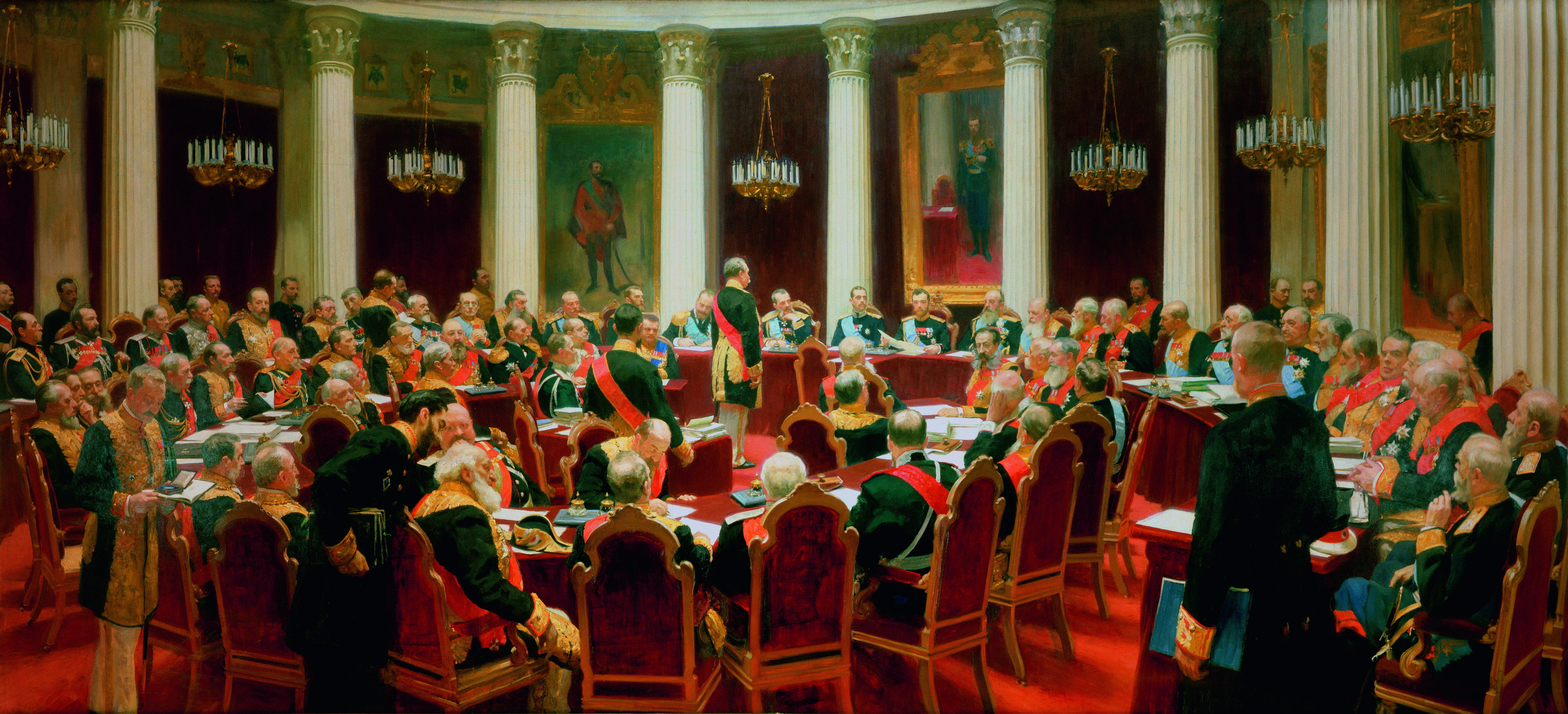 dedicated to perhaps Russia’s most popular painter, Ilya Repin – one work overshadows them all. Hanging at the far end of the huge gallery space on Krimsky Val, the monumental Ceremonial Meeting of the State Council on May 7, 1901 from the collects