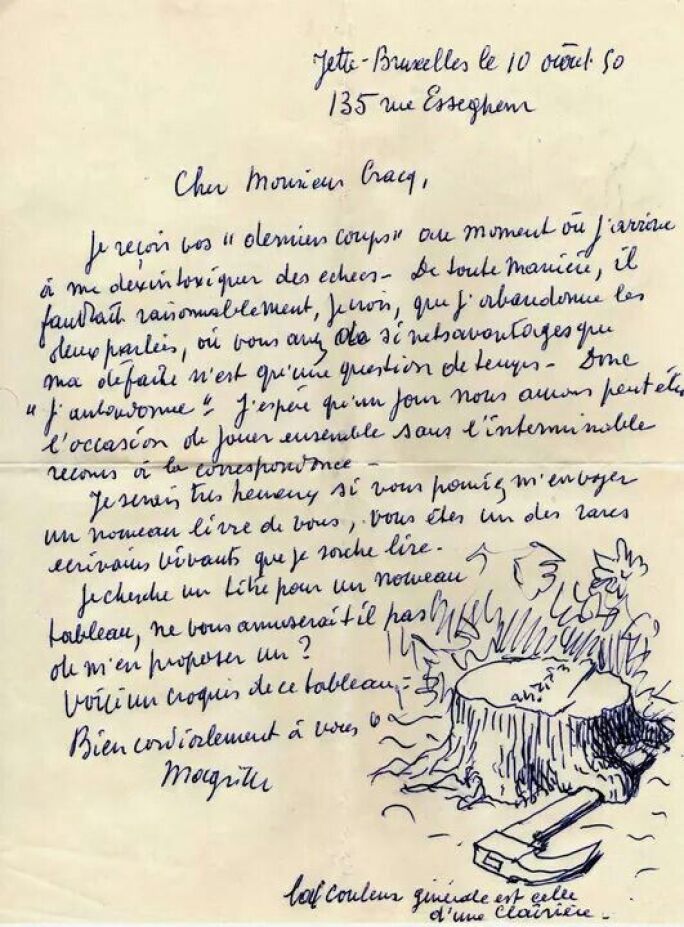 Gracq wrote in response to the below letter sent by the artist three days earlier. The letter is mostly an expression of frustration over Gracq beating Magritte in chess; however, the final sentence translates to: “I am looking for a title for a new painting, would it amuse you to suggest one for me? Here is a sketch of the painting. Yours sincerely, Magritte”
