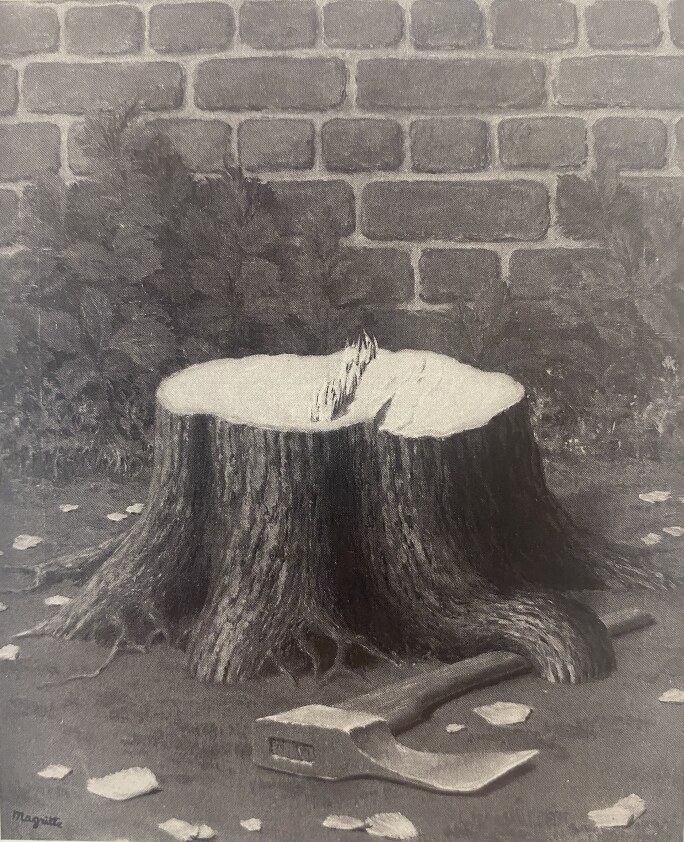 s in all of Magritte’s best work, the present sculpture contrasts the known with the impossible. Here, it seems the roots of a chopped tree have overgrown the ax used to cut it down. A near impossibility, yet somehow plausible enough to engage a viewer in a series of “what-if” questions. In this artificial and puzzling composition, Magritte causes us to question constantly – and in leaving the questions unanswered, the artist creates a brilliantly enigmatic and powerful work.