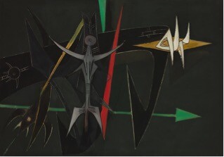 In La Fugue (La Terreur, La Peur dans la nuit), 1949, the upper and lower figures display horned birds suspended in mid-flight, meeting the gaze of the viewer with a blank yet penetrating stare. In a 1950 interview, Lam distinctly relates these “diabolical birds,” to a childhood experience watching a bat trapped in his bedroom, which darted about as “Rays of light from the exterior… penetrated every crack, creating shadows, changing the space into a magic lantern and reversing all the images.” (Lowery Stokes Sims, Wifredo Lam and the International Avant-Garde, 1923-1982, Austin, 2002, p. 98) For Lam, this formative incident marked the moment of his understanding of human consciousness and the passage of t.mes ; its inclusion here heralds a critical moment of transition in his painting as he began to integrate his intricate mystical iconography with symbols of deep personal significance. Moreover, this otherworldly bird evokes layered associations, symbolizing both in Santería and Christian traditions a messenger between spiritual and earthly realms. The central figure evokes similarly complex associations. It presents neither head nor tail, but rather an elongated being, and two black wings darting outward in opposite directions.