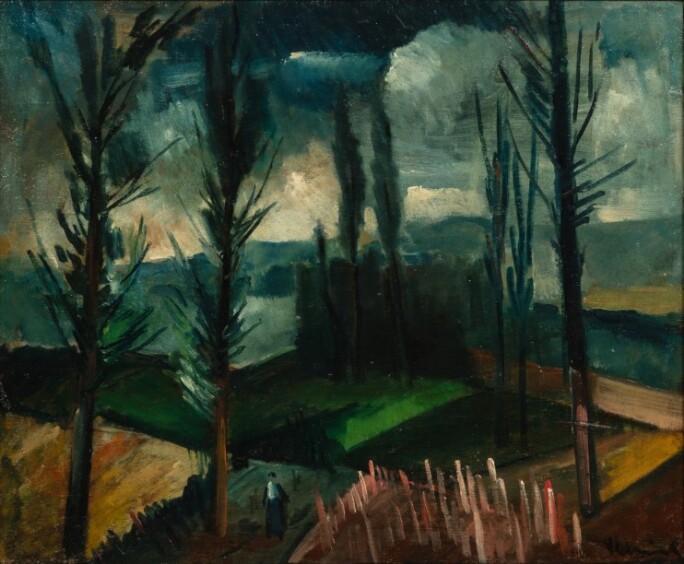 In his later career, the artist departed from the vibrant and simplified abstractions of the Fauvist style, opting instead for a more restrained and realistic approach characterized by a limited color palette. Although Paysage was created while Vlaminck was still in the thralls of Fauvism, it presents a moody ambience and darker palette, which diverged from the artist’s typical work during the period. Paysage showcases an intimate rural landscape with trees surrounding small village homes emerging from the pasture. The softly sweeping brushworks rhythmically placed throughout the canvas work in harmony with the stormy palette to create an almost otherworldly scene. Uniquely Vlaminck in its nonconformist quality, Paysage is one of the first examples of the style that the artist would later embrace nearing the end of his life.