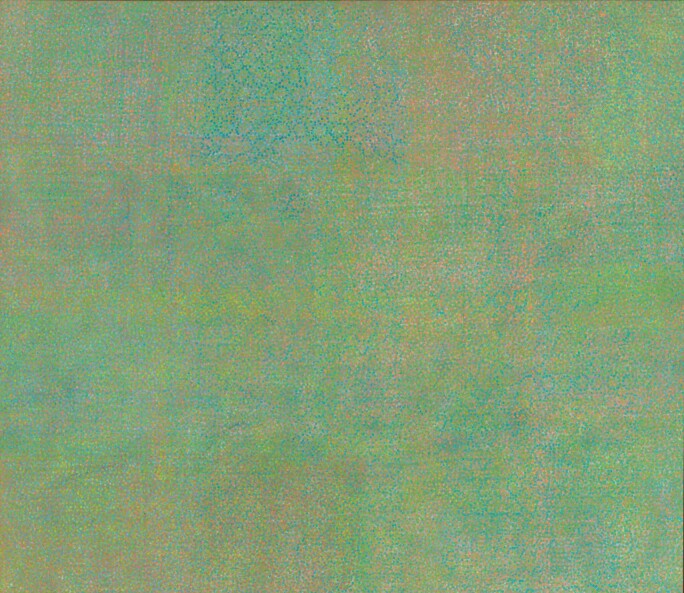 To create the present work, Pindell pierced holes into discarded cardstock, tin plates, and manila folders to make stencils, through which she sprayed layers of gesso and acrylic paint onto the canvas; through repeated application, she built up labor and t.mes -intensive layers across her towering surface. By meticulously placing each layer, Pindell creates a captivating surface of diffused points of color and light. As art critic Barry Schwabsky describes, Pindell's paintings "encourage the eye to overcompensate by refining its perceptions to the point where the minute differences from one moment of color to the next suddenly loom vast." (Barry Schwabsky in Exh. Cat., New York, Garth Greenan Gallery, Howardena Pindell: Paintings, 1974-1980, 2014, p. 7) Entrancing the viewer in its intricate and expansive surface, Pindell's dots of color appear to shift and energize as the gaze scans the work; revealing a gleaming mirage of grid-like forms and variating hues, the canvas appears to illustrate infinite universes within and without.
