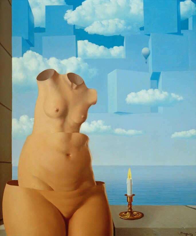 The present composition is a particularly intriguing variation, with the background rendered at the same t.mes as both an interior and exterior. A characteristic wood-panelled wall, which appears often in Magritte’s imagery, is broken to reveal a non-descript landscape behind it, consisting of a still sea and a cloudless sky. Later in the decade, Magritte transformed this image by replacing the standing nude with a three-part torso, thus further reducing the image of a woman to a man-made object, evoking a sculpture despite her naturalistic flesh tone (fig. 3). The connection between these two works relates to one of the artist’s earliest and most famous works, in which the female body (and the painted work) was broken down into separate parts (fig. 4). This seminal work underpinned much of Magritte’s art in the way it presented a challenge to conventions of representation and perception; the same tension is evident in the present work, which is at once beguiling and intriguing in its transformation of the everyday into something remarkable.