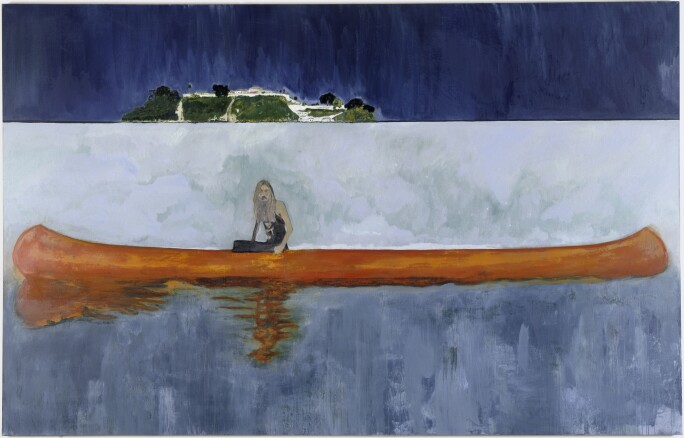 Wong's virtuosic handling of paint in The Jungle draws the viewer into his prismatic nightscape as dots, wiggles, and strokes coalesce with feeling in a somber yet.mes ditatively lustrous symphony. Above a central body of water, Wong conceives a dense jungle of chromatic trees and patches of smaller, thickly applied brushwork that suggests the image of fallen leaves on the jungle floor. The wind seems to whistle through the tress in effervescent speckles of evergreens and oranges, harmonizing with the deep blues and blacks of the nightscape. With his impasto technique, Wong conjures the nocturne rhapsody of the jungle landscape that is interrupted by nothing other than a lone pilgrim clad in red, drifting slowly in his canoe. The pensive figure faces the surrounding wilderness of the jungle, emphasizing the grandeur of the fantastical natural landscape while embodying a stand-in for the viewer. Writing about Wong’s 2018 exhibition at New York’s Karma Gallery, art critic Roberta Smith observes, “[Wong's] paintings are extremely open and vulnerable. But once they lure you in, they leave you alone to explore their chromatic, spatial and psychological complexities. This mysterious journey is often signaled by a smooth pathway leading inward from a painting’s bottom edge — which is somet.mes s being traveled by a shadowy solitary walker.” (Roberta Smith, “A Final Rhapsody in Blue from Matthew Wong”, 24 December 2019, The New York t.mes s (online))