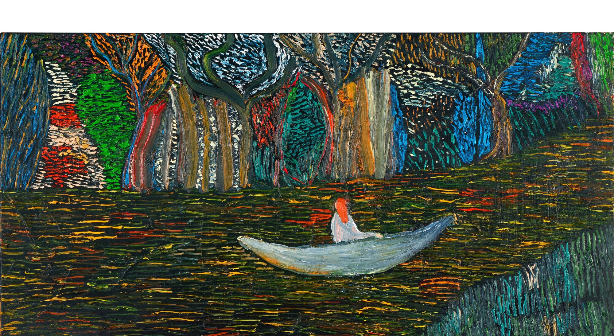 Shimmering with an array of lustrous chromatic dashes and dabs, The Jungle by Matthew Wong presents a mystical nightscape featuring the artist’s signature lone figure, sailing dreamily across a cascading river. Executed in 2017, The Jungle is an early example of Wong’s celebrated moonlit landscapes, a genre to which he later dedicated his solo show, Blue at Karma Gallery, New York, which opened posthumously in 2019-2020. The solitary, faceless figure is a recurring and significant motif found in Wong’s mature paintings: often interpreted as a surrogate for the artist himself, the lone figure typically wanders winding paths across rolling hills or navigated interminable bodies of water in small row boats, as in the present work. Above this figure, Wong’s bulbous trees line the top edge of the water’s bank, extending beyond the confines of the canvas to suggest a continuous narrative. Intriguing and impactful, The Jungle revels in the artist’s idiosyncratic visual language of texture and color as he evokes in his impasto landscape an inner loneliness and a profound sense of isolation and longing.