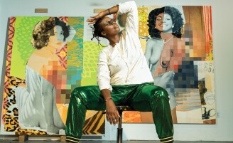 Thomas presents her intimate knowledge and understanding of art history through her luxurious compositions, making reference to master painters such as Édouard Manet, Henri Matisse, and Gustave Courbet. Through her own paintings, Thomas redefines the narrative and places the black female model unapologetically at the center; she references art history while subverting and redefining it. A modern take on Manet’s Olympia from 1863, Thomas undermines the male gaze that is embedded in canonical art history; she displays her model with the same bold gaze as the original subject, yet she is clothed, and she is alone. The striking patterns, glitter, and beading that Thomas uses in her oeuvre, too, introduce another degree of accessibility—in the words of Ian Alteveer, curator of Modern and Contemporary Art at The Metropolitan Museum of Art, “Mickalene’s work may be steeped in the history of painting and portraiture, yet there is an accessibility to everything she does—the colors, the compositions, the glitter.”