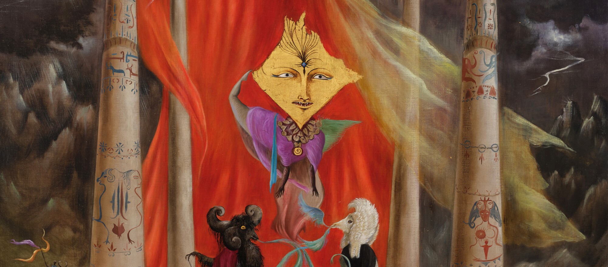 Teeming with mysterious figures and dramatic pageantry, Leonora Carrington’s 1954 painting Temple of the Word represents the artist at the height of her visionary powers. On full display is her deep interest in the archaeological remains of the ancient world combined with an understanding of the theatrical nature of magical initiations and their symbols. Quoting from a wide array of esoteric traditions, Carrington absorbs and then transforms her sources into her own unique visual language. Against a stormy nocturnal backdrop of rocky mountain peaks, illuminated by a full moon and a bolt of lightening, the monumental “temple” arises. Vaguely Minoan and Egyptian in its architectural form, the edifice is decorated with glyphic markings as well as animals, in particular cows and bulls, both sacred to those cultures.