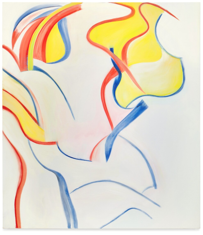 L uminous, kaleidescopic ellipses of cerulean, scarlet, and yellow pirouette across the pristine alabaster ground of Alice Baber’s The Flame of the Banner of the Jaguar of 1981. Created by applying diluted paint with linen rags, the present work’s bubbles of pigment see the levity and lyricism of Baber’s signature style at their absolute height. Spectral, atmospheric primary hues bleed into one another and into the weave of the canvas, and color and form find unity on the surface of the picture plane. Test.mes nt to her critical importance in the Color Field movement, Baber’s work is held in such esteemed institutional collects ions as The Metropolitan Museum of Art, New York; Solomon R. Guggenheim Museum, New York; Whitney Museum of American Art, New York; and Museum of Modern Art, New York, among others. On jubilant display in The Flame of the Banner of the Jaguar, the idiosyncratic abstract lexicon she so tirelessly developed as both artist and feminist thinker evinces the freedom of expression she championed over the course of her three decade-long career.