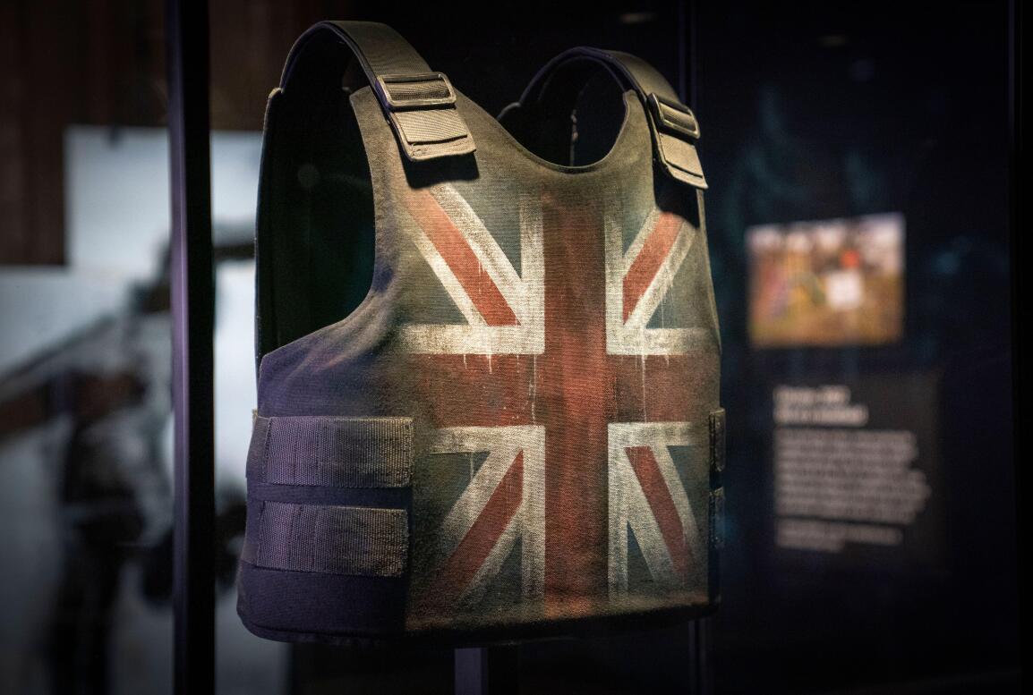 A poignant and provocative work, Banksy’s Vest from 2019 fuses patriotism with the realities of violence sweeping a nation, rendering it an unforgettable reflection on the fractured state of British identity. One of only five in existence, Vest belongs to Banksy's Gross Domestic Product homewares line, which was first displayed in a shopfront in Croydon in South London in 2019, to comment on the impending commercialisation of the Banksy brand. Addressing the stark realities of the United Kingdom’s surge in knife crime, the present work is a striking reinterpretation of the traditional John Bull gentleman’s waistcoat – an item long associated with British society, from the working class to the elite. Vest is a piece of armour incorporating a genuine, former police-issue bullet proof vest capable of stopping rounds from a gun. An object associated with law and order, or worn from fear and paranoia, Vest is adorned with a black, white, and blue Union Jack, however, the iconographic sombre tones are disrupted by a rusty red hue suggestive of dried blood. This subtle yet powerful insinuation of threat to life evokes a sense of mourning, marking Vest as a chilling emblem of Britain’s present moment.