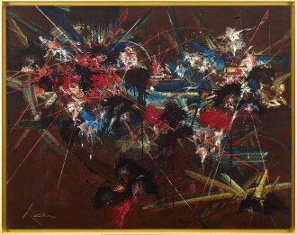 An outstanding performer, Georges Mathieu is unafraid of drawing in front of others. He confronted the large-format canvas like a combatant wrestling with colours and pigments, offering a dramatic visual impact to the viewer. Also a talented theorist, Mathieu offered viewers the opportunity to understand his unique aesthetic views. For instance, in a 1971 lecture in Brussels, he asserted that “not only creation shared by all but creation made by all, with each person becoming a particular form of artist, with each of our actions bathing in a grace in which the aesthetic would be indissociable from the ethical.” Ever examining the role of art in society, Mathieu was careful that his art did not.mes rely indulge in superficial emotional release. The present work, entitled Espoirs cruels, offers the viewer a figurative direction of associative thinking; in overlapping layers of colour blocks, several golden strands are refracted from the centre, symbolizing light’s triumph over darkness. The blue, white and red in the back refer to the tricolore of the French flag and represent the tripartite motto of the French people: liberty, equality, fraternity. At the t.mes , Mathieu was hailed as the official representative of French art, his works reflecting his concern and consideration of society, as well as a keen desire for contributing towards the greater good through his paintings.