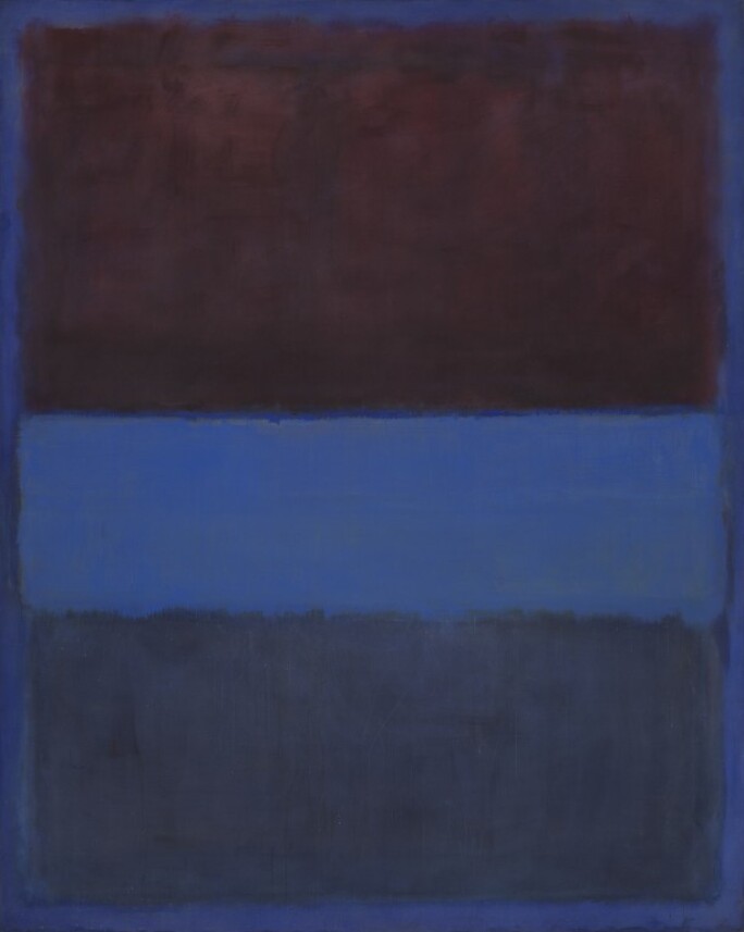 A highly characteristic example of Reinhardt’s paintings from the early 1950s, Untitled features dark, muted strips of red, blue, maroon, and purple. The work is set apart by its vertical staccato marks that go from top to bottom, encouraging the viewer’s eyes to dart across the surface of the canvas. Like the direction of the brushstrokes themselves, Reinhardt chose a vertical format, and a relatively modest scale. The work has a mystical quality, with no indication of landscape or recognizable objects. It is quintessential Reinhardt, who rejected the interpretation of meaning into his artworks, and insisted on creating art for art’s sake.