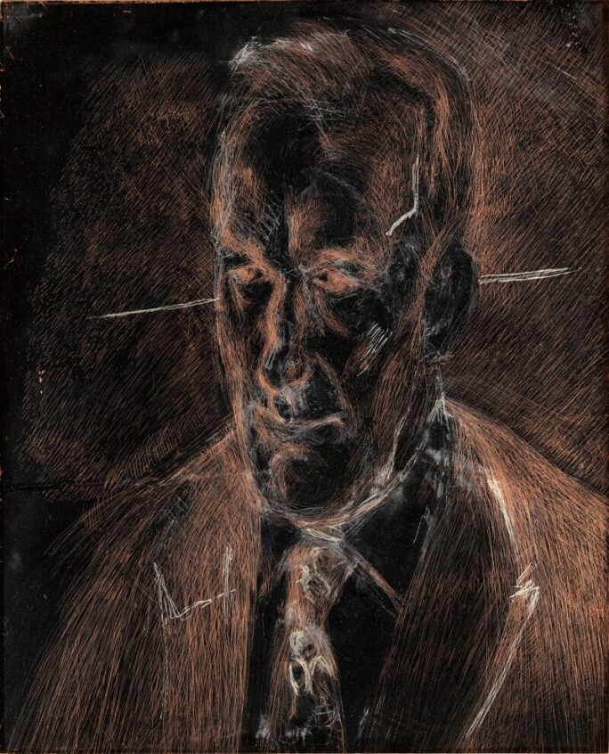 Sadly, the work, which was initially intended as an etching, was ultimately never used, with Freud’s final chalk marks still visible across the highly worked copper surface