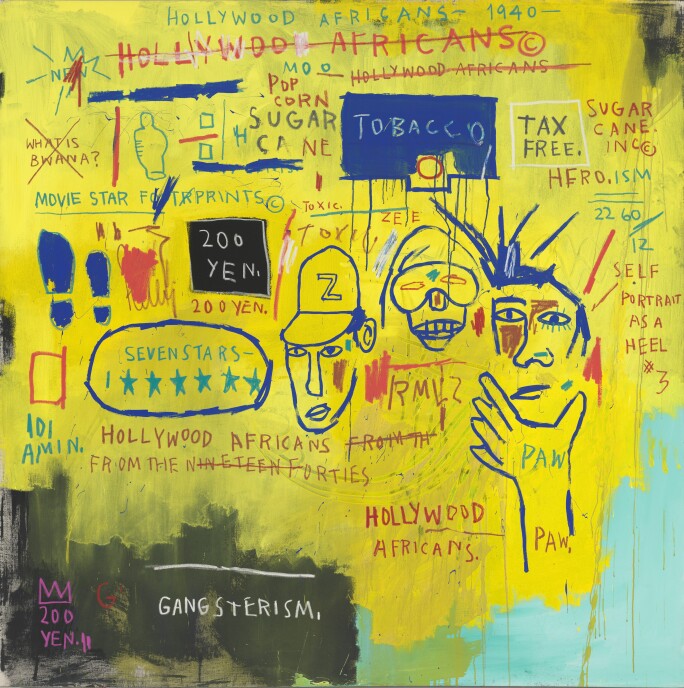 Belonging to a suite of 12 monumental canvases that Basquiat painted in 1983, Museum Security (Broadway Meltdown) stands among the most ambitious works of this celebrated group. At the center of this group are Museum Security (Broadway Meltdown) and the closely related painting, Hollywood Africans —now in the collection of the Whitney Museum of American Art, New York—which together present the most layered and conceptually rich explorations of Basquiat’s iconography and language.