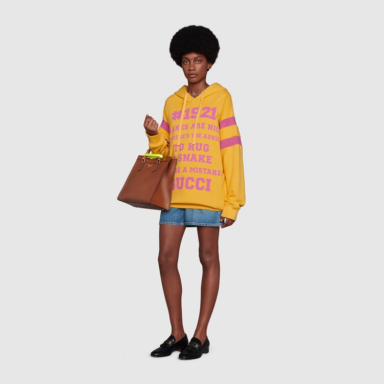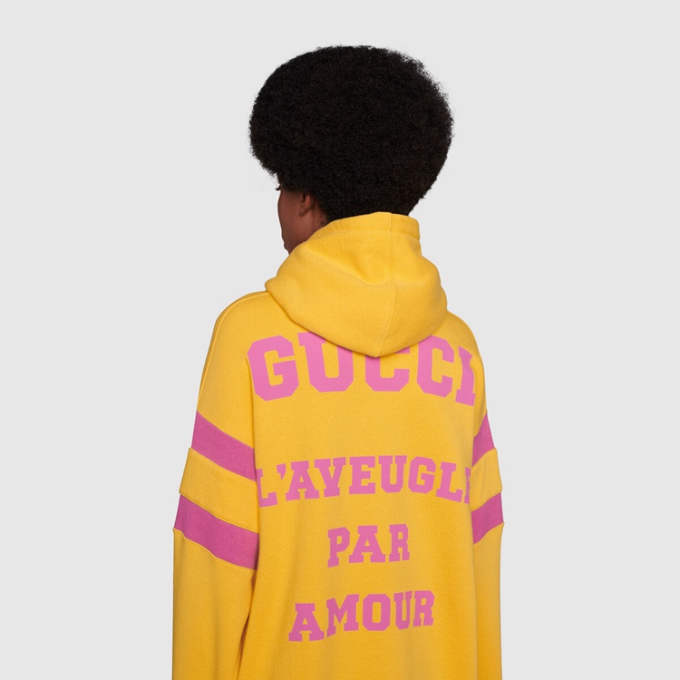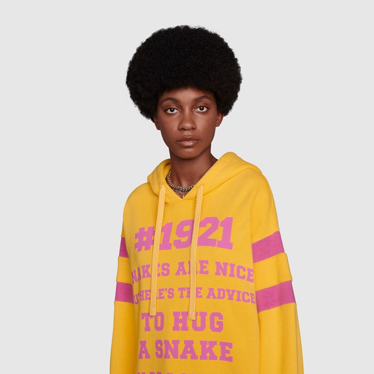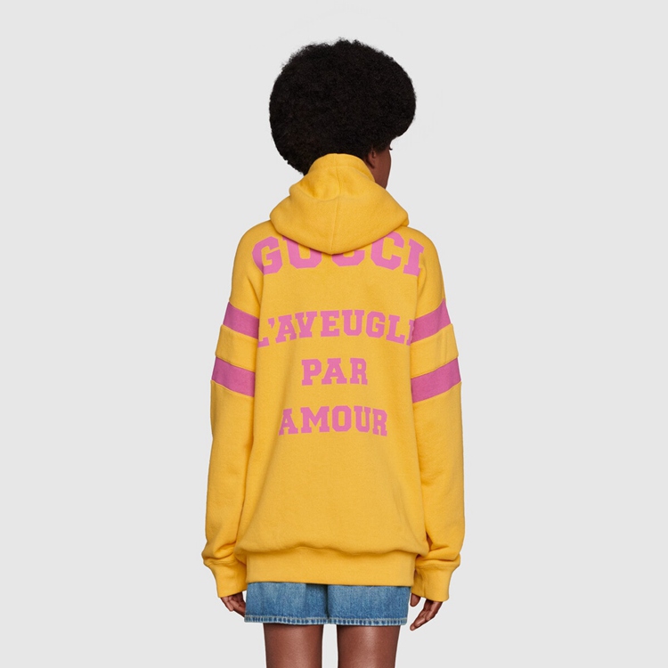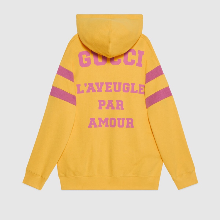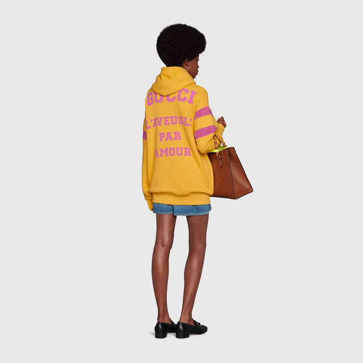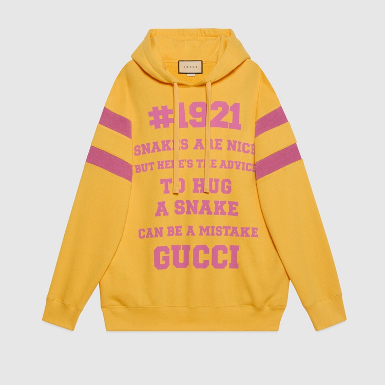 Style 683276 XJD3E 7256 Prints Inspired by endearing British nursery rhymes come together With various elements of The House For New interpretations of staple pieces. On The front of This yellow sweatshirt, The year of Gucci’s founding accompanies The quote “Snakes Are Nice But Here’s The Advice to Hug a Snake”. On The back, ‘L’Aveugle Par Amour’ plays on The House’s romantic inspirations.