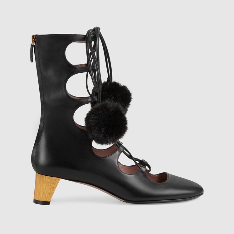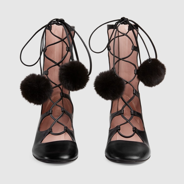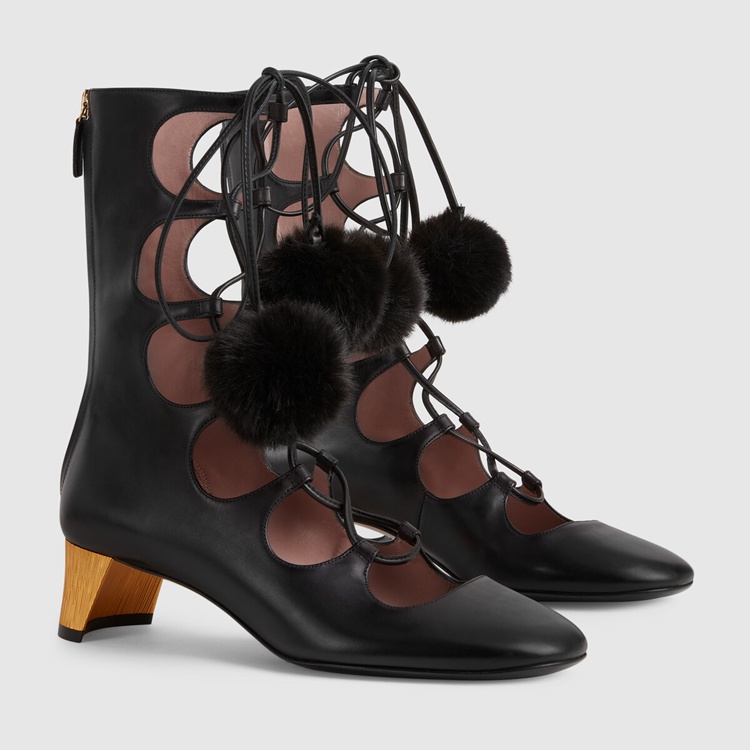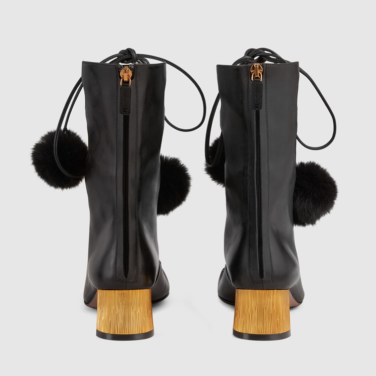 Style 400087 1M0B0 1000 Emblematic looks from The first Alessandro Michele collection are presented again For The Ouverture collection and create a link to Gucci’s rich history. This lace-up boot is presented as Part of The selection. Crafted from black leather, The style is completed by a squared toe and playful pom-poms.