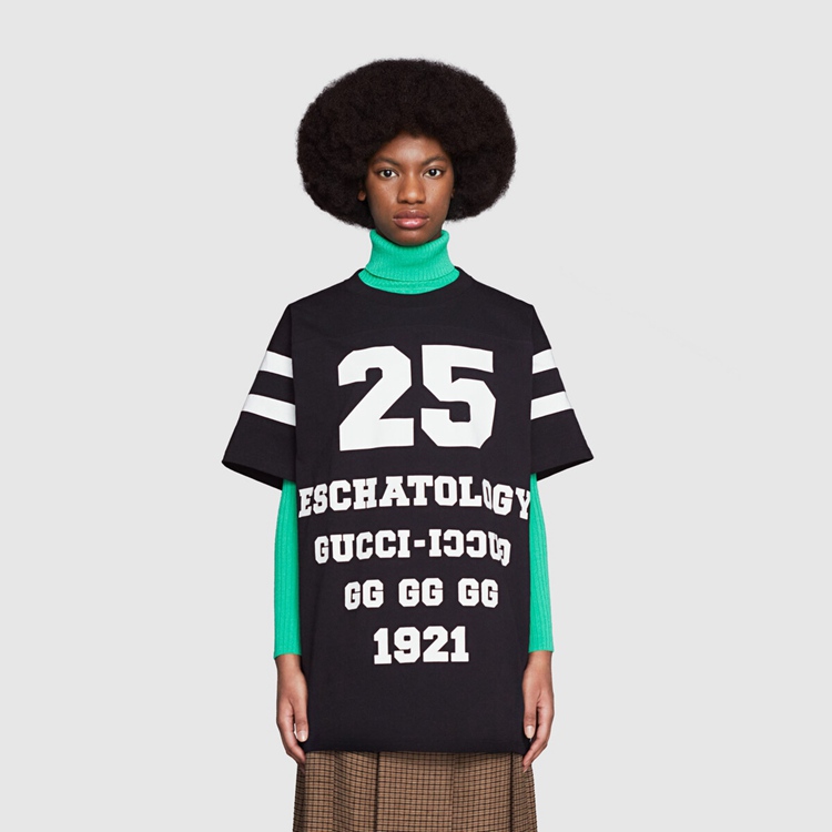 Style 660744 XJDKK 1289 This cotton jersey T-shirt features The number 25, The Creative Director’s lucky number, alongside ‘Eschatology’, a doctrine that explores The ultimate destiny of humans and The universe. The ‘ Gucci Loved’ print adorns The back.