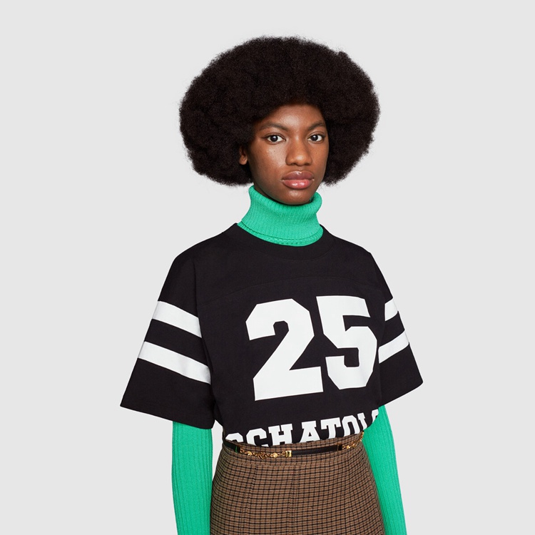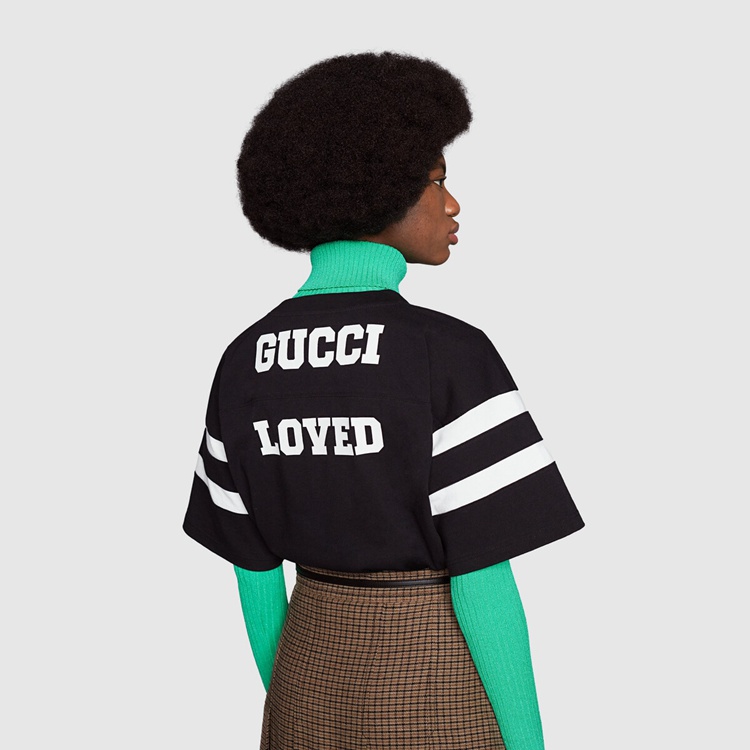 - Black cotton jersey With white ’25 Gucci Eschatology and Gucci Loved’ print