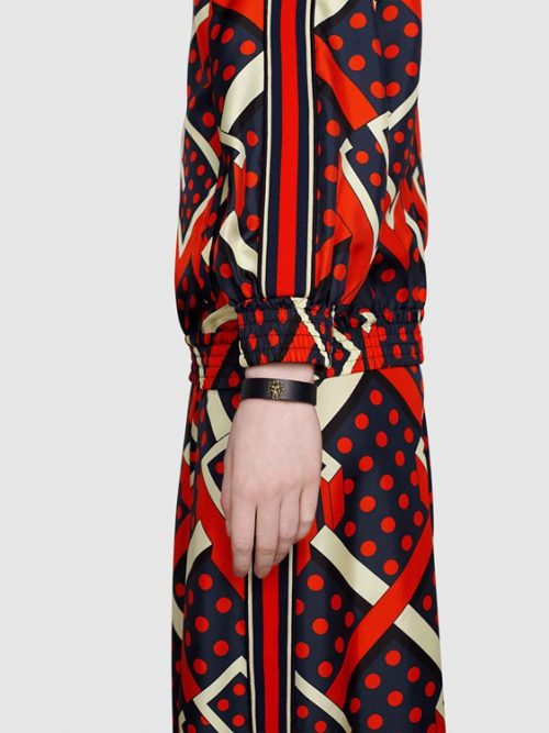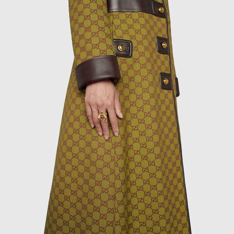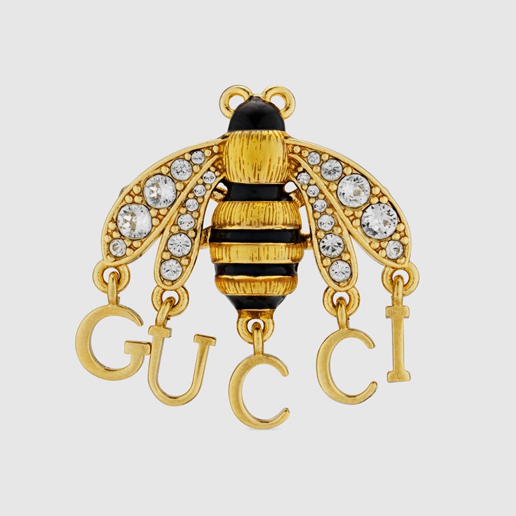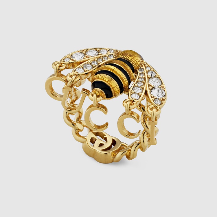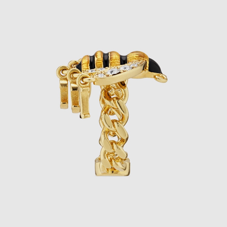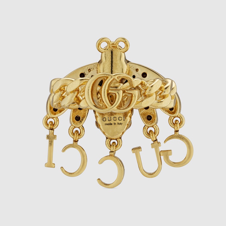 Style 679015 I6656 8097 The bee is a historical symbol from The House archives, first introduced in The 1970s. It has since become a signature detail, representative of Gucci’s fascination nature. Here it takes The form of a ring With enamel details and sparkling crystals. The Gucci script detail and The Double G, featured on The chain, complete The design With a distinct logo feel.