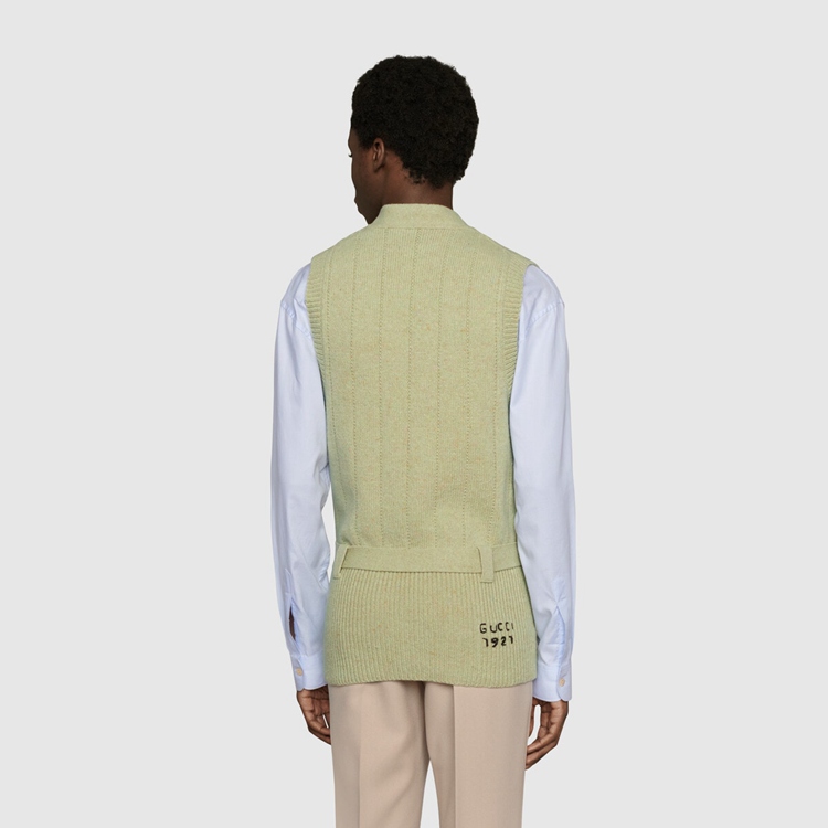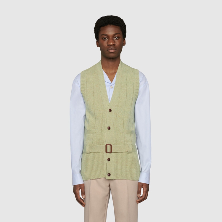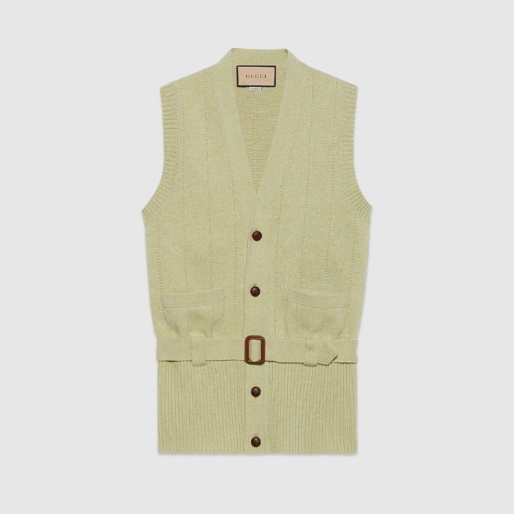 Style 673870 XKB3 A 3222 The Gucci Aria collection is named For a term that comes from music, indicating a melody sung by a single voice from an opera. This rib wool vest has a button-down front and a knit belt With leather buckle.