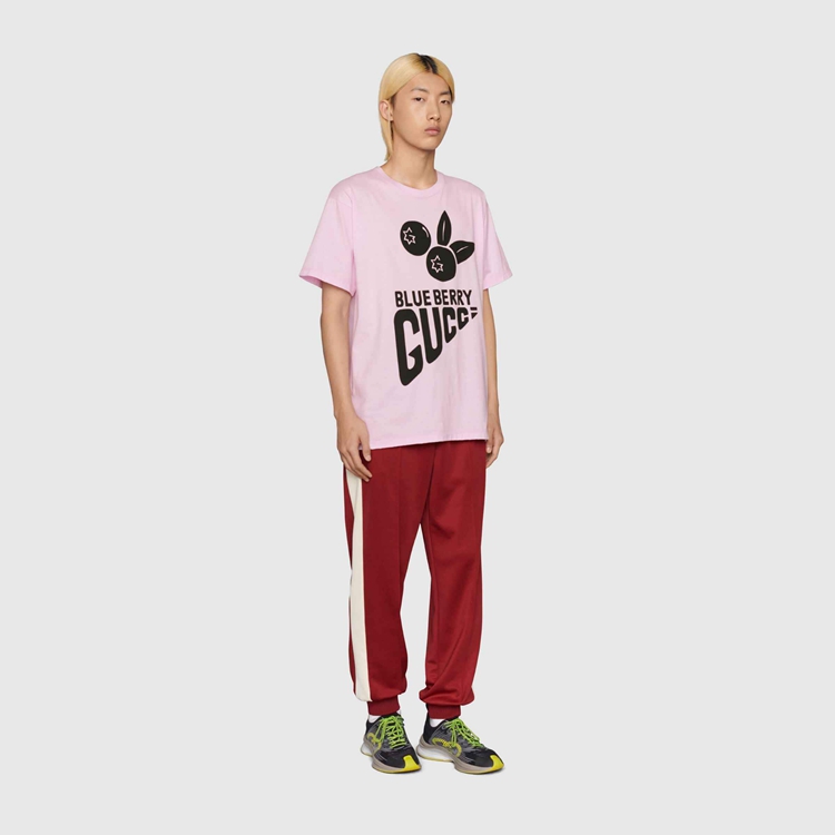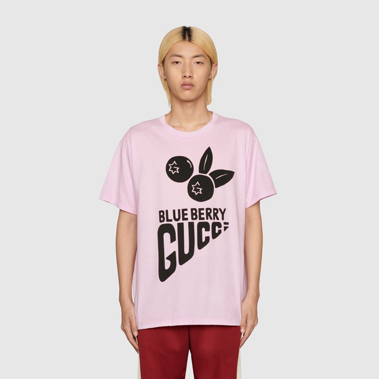 Style 616036 XJDWE 5595 Part of The Gucci references to pop culture, fruits in all shapes and forms continues to enrich The House’s narrative. For Aria, they appear as playful prints, often enriching a selection of ready-to-wear pieces. This light pink cotton T-shirt is animated by a ‘Blueberry Gucci’ print in black.