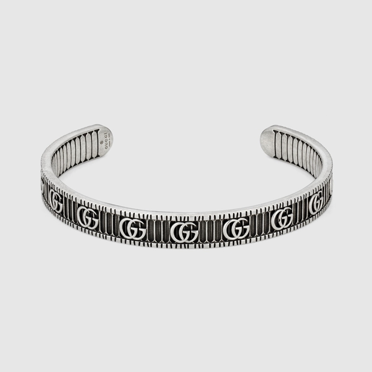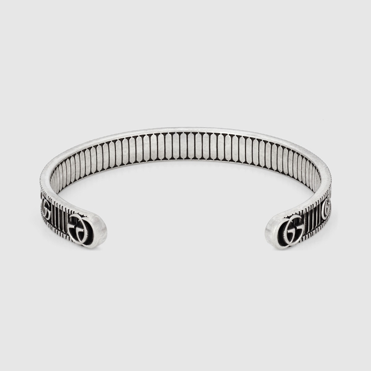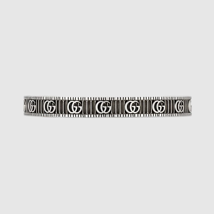 Style 551903 J8400 0811 The Double G continues to define House designs. A contemporary take on an archival Gucci belt from The ’70s, The distinctive symbol is combined With engraved patterns on a collection of silver jewelry. Set against a three-dimensional striped design With a bi Color effect, The Emblematic code brings dimension to a thin cuff bracelet.