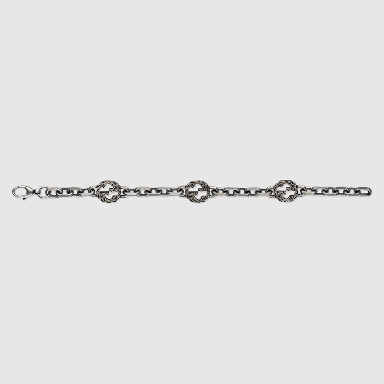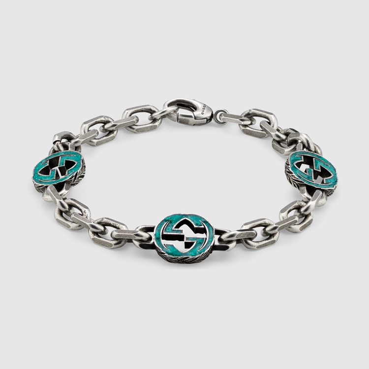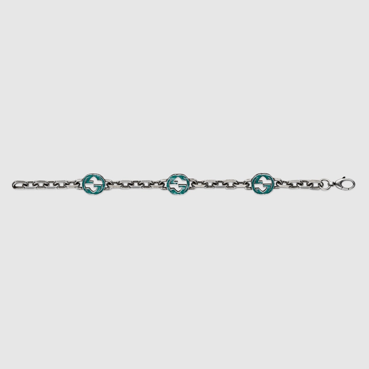 Style 656787 J8410 8183Gaining notoriety in The 1960s, The Emblematic interlocking G logo is representative of Founder Guccio Gucci’s initials and has since been reintroduced in a variety of forms and interpretations. For This collection The distinguishing emblem is reintroduced in a more colorful interpretation and enriches a silver bracelet.