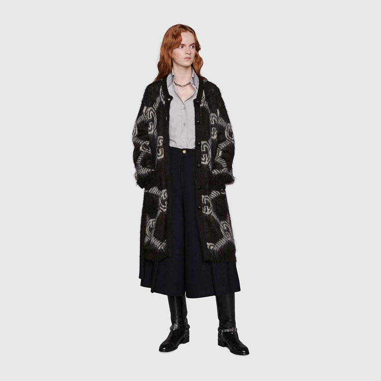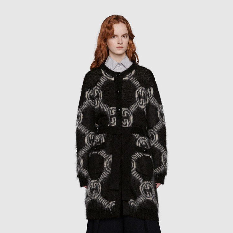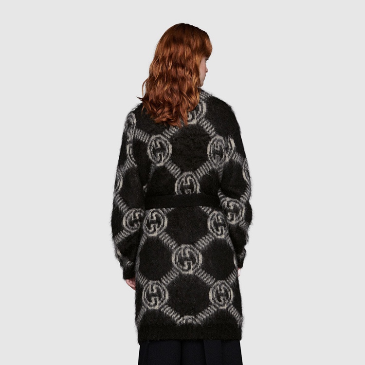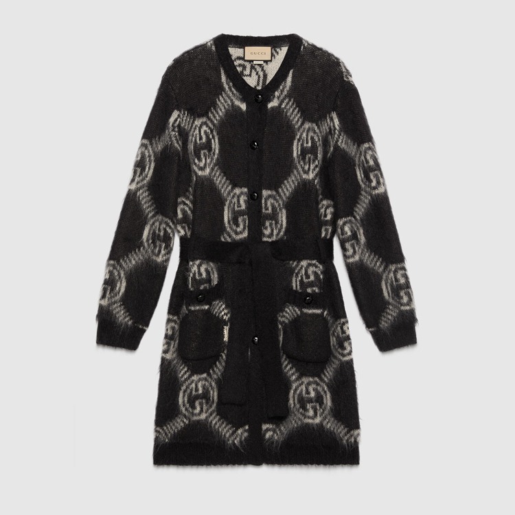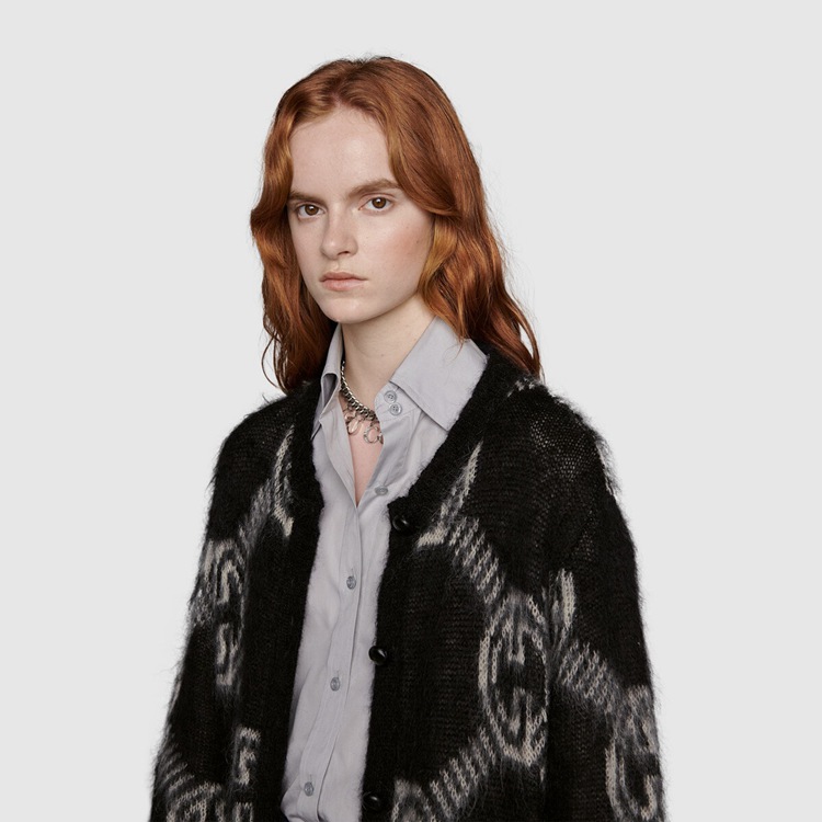 Style 678835 XKB6K 1289 The Interlocking G has remained One of The most symbolic codes of The House since its introduction. The distinguishing emblem appears throughout The collection, enriching a selection of ready-to-wear pieces and accessories. Here, The logo is presented as an allover jacquard pattern atop This brushed mohair cardigan.