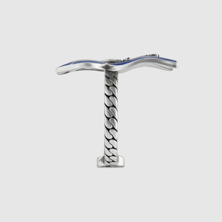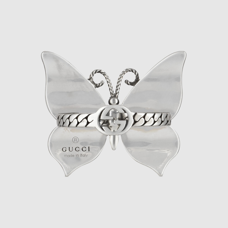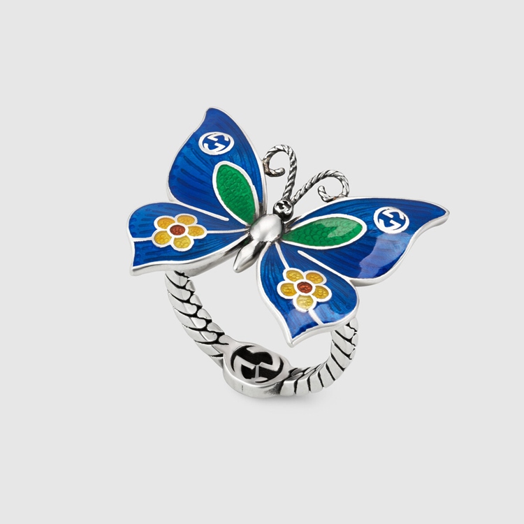 Style 678676 J8410 8520 Part of The fascination For nature and animals that enriches The Gucci narrative, The butterfly has become synonymous With The House. Here it appears as a colorful centerpiece to This silver ring, decorated With Interlocking G details For a subtle logo touch.
