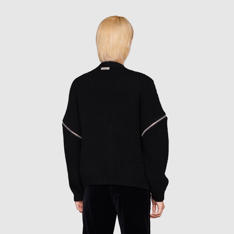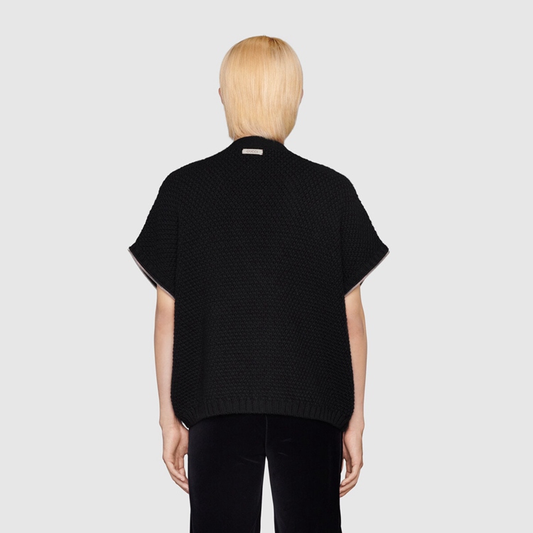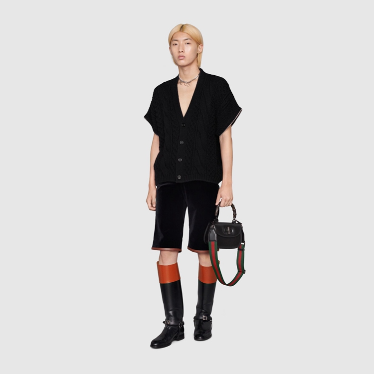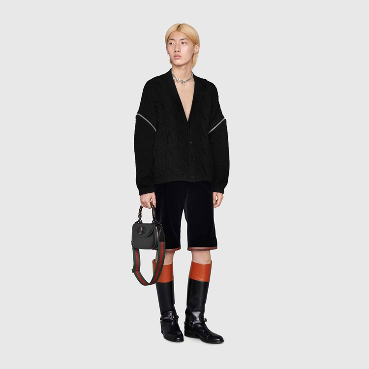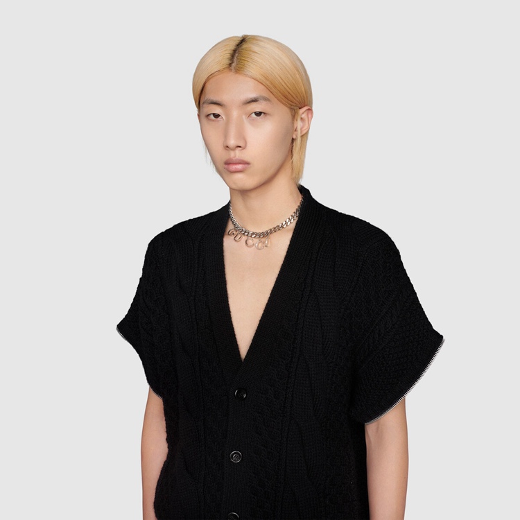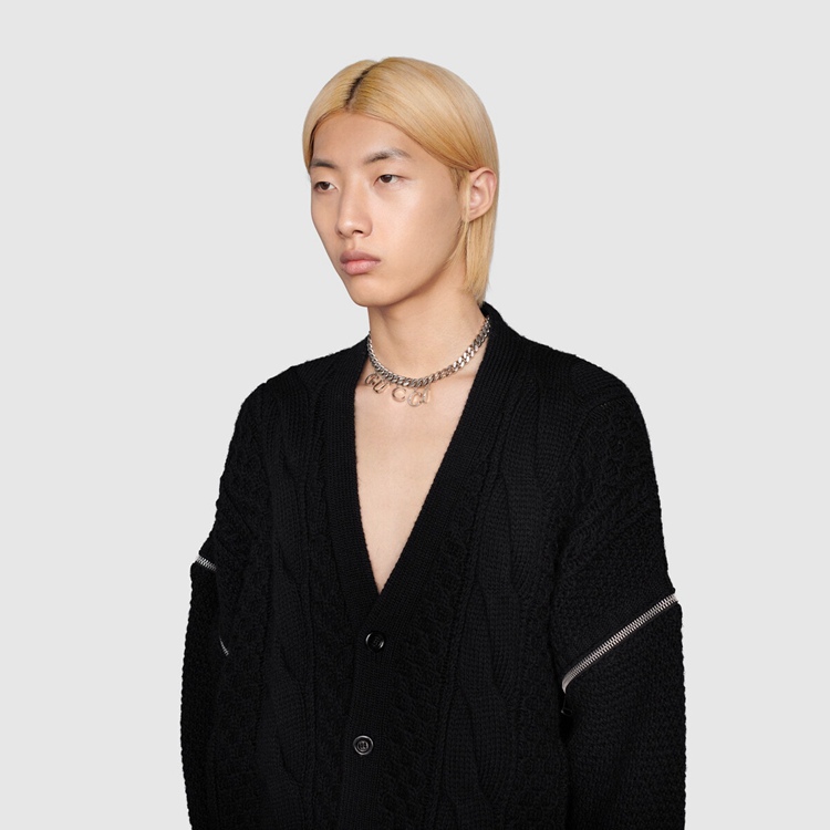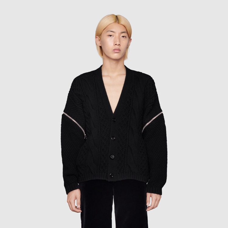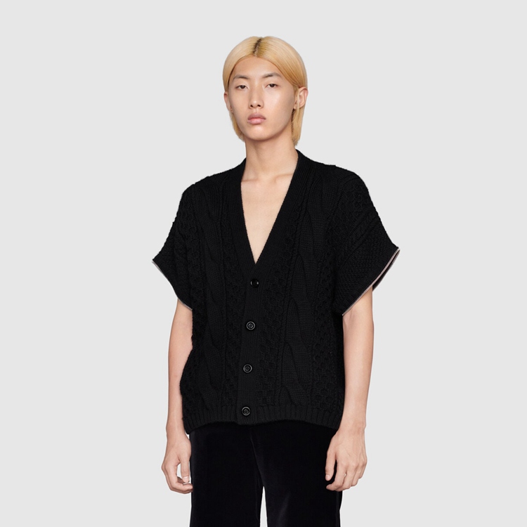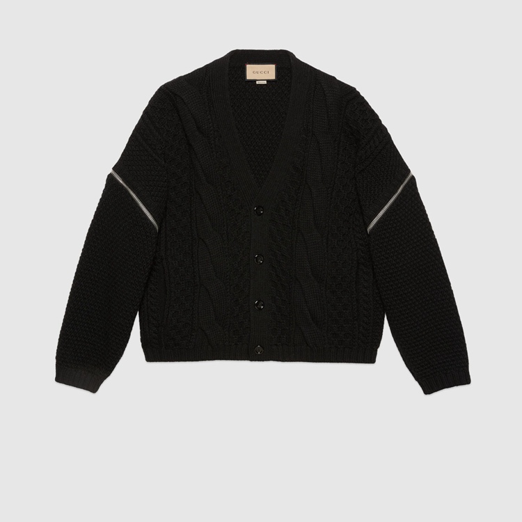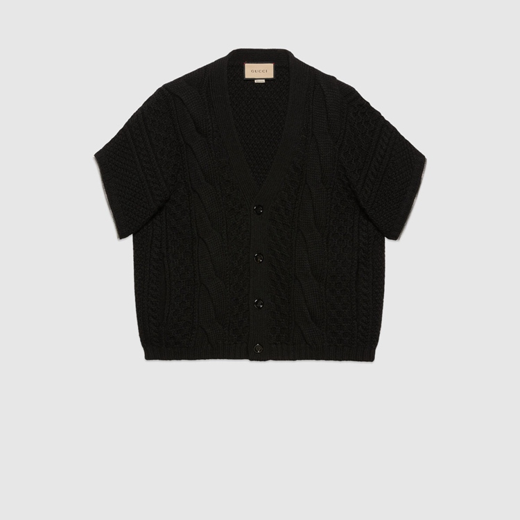 Style 681624 XKB22 1000 A chunky cable knit cardigan in black wool. Knitwear With removable sleeves pushes The juxtaposition of what is expected and what is there, a concept that is further explored in New ways For Gucci Aria.