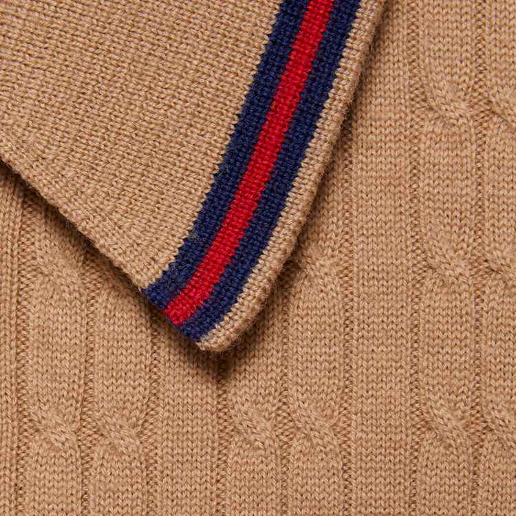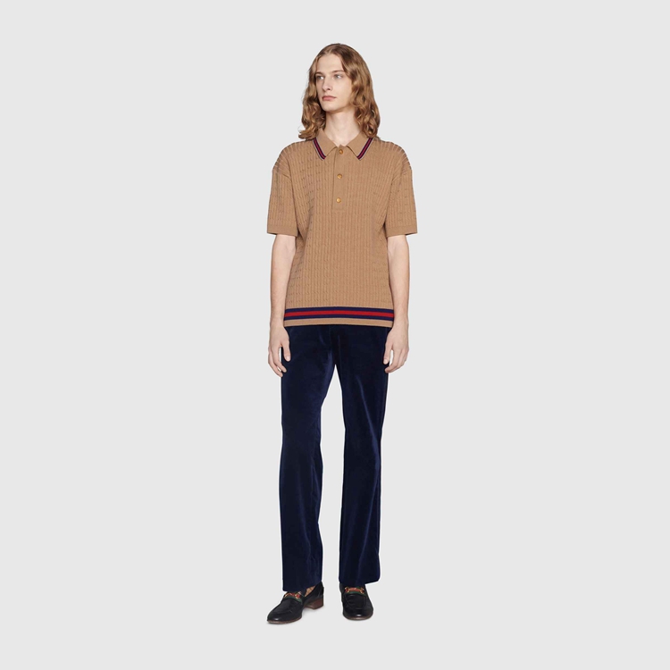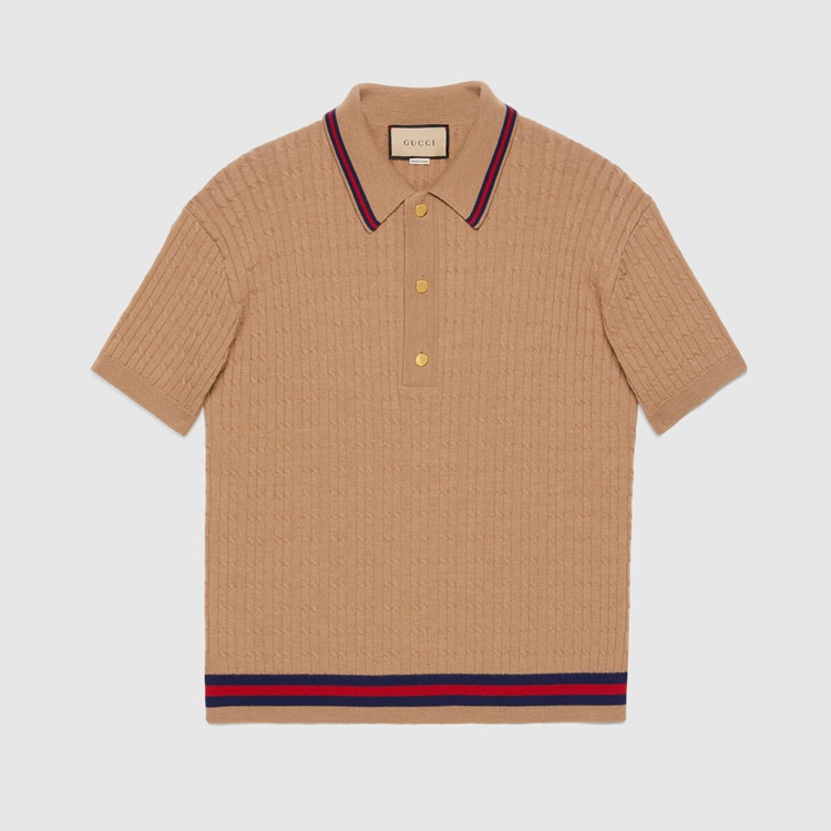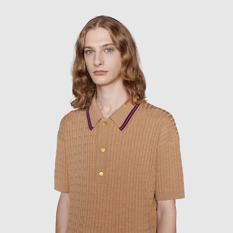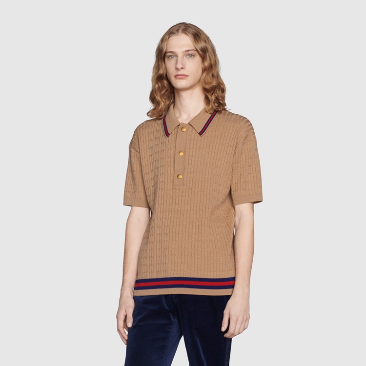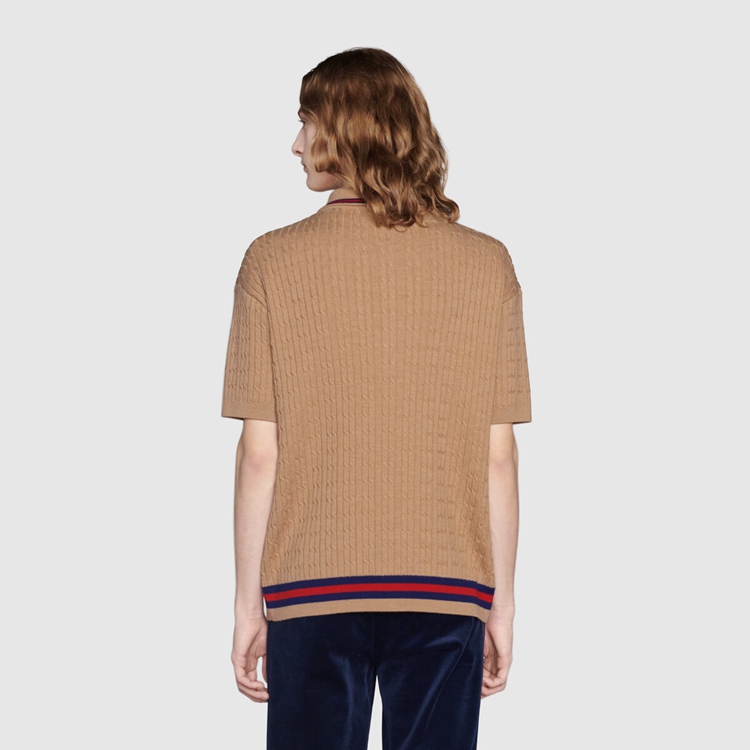Style 673659 XKB2Z 2094 Gucci Aria is an ode to both The traditional and The contemporary nature of The House. Symbols that have defined different eras appear as recognizable logos and through subtle hints to The past. This cable knit polo shirt is decorated With The green and red Web.
