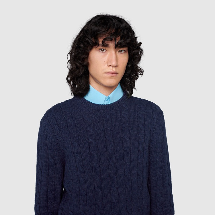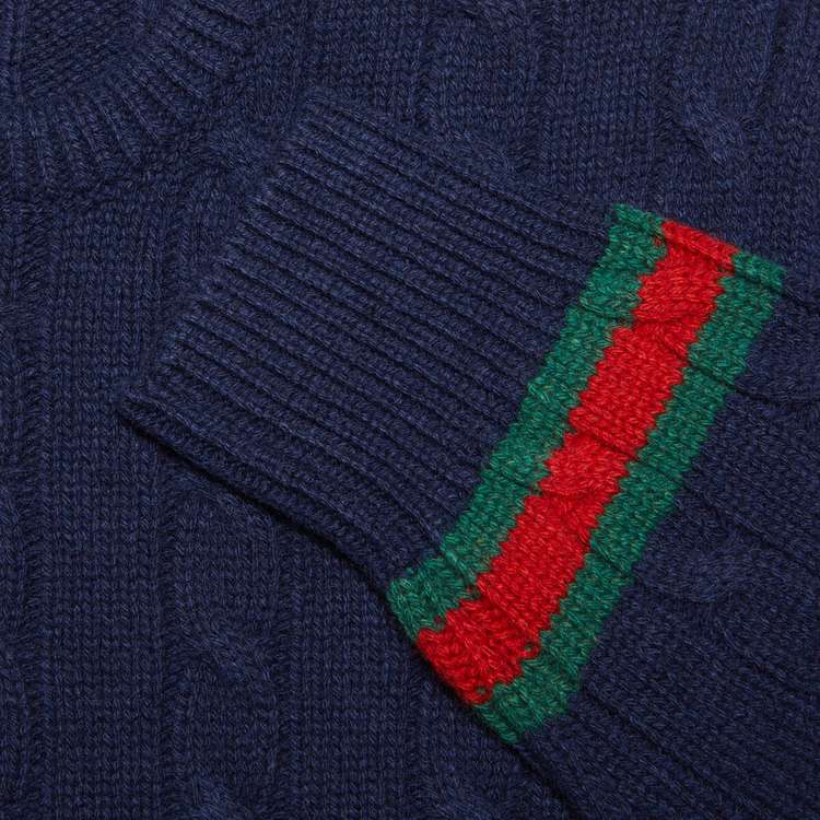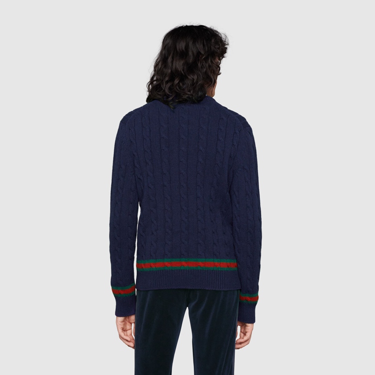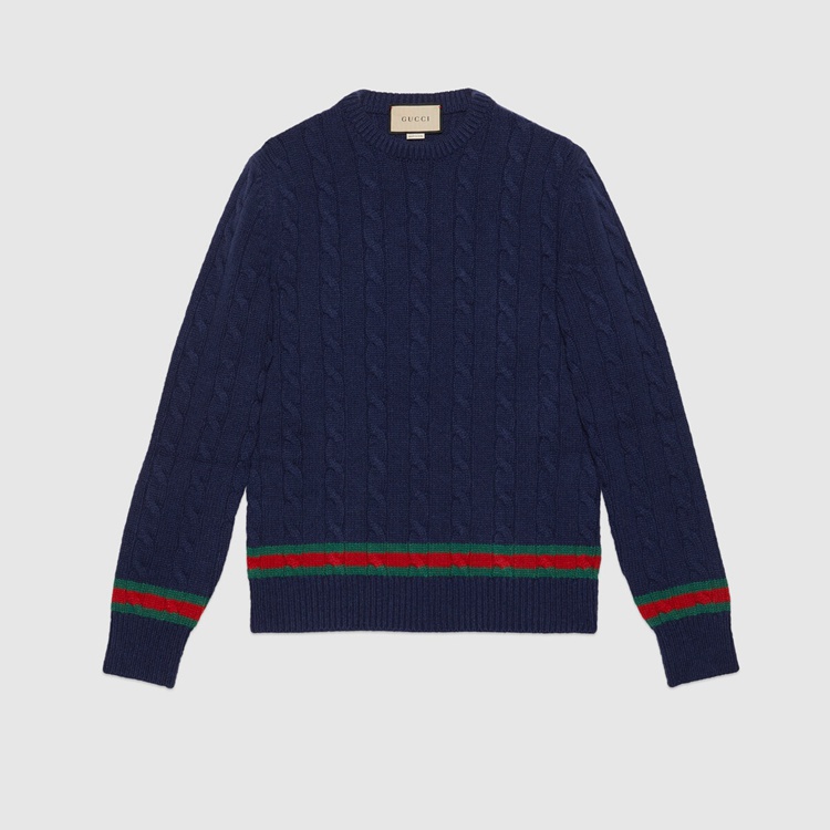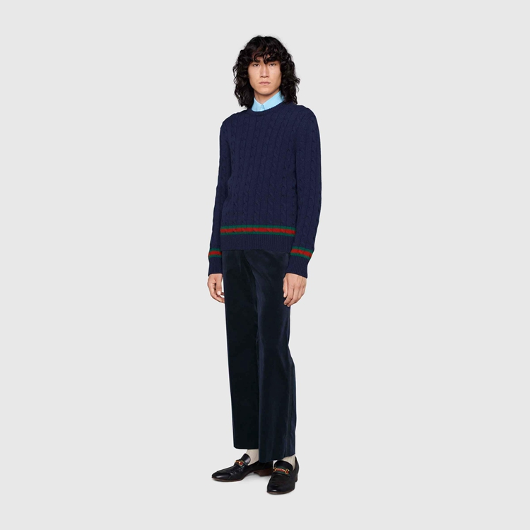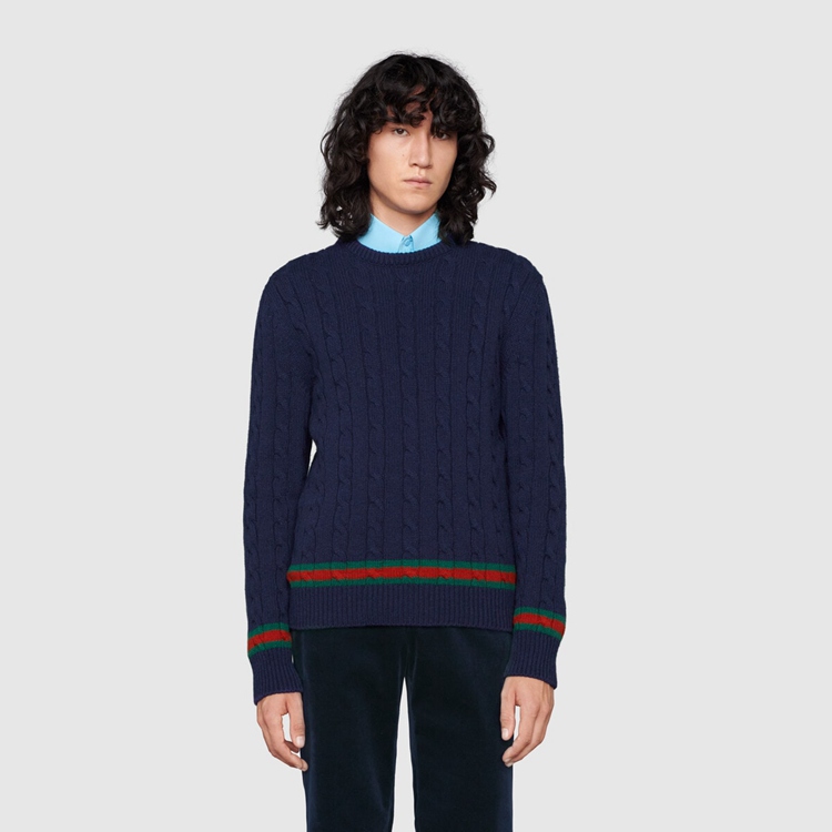 Style 673489 XKB2N 4684 A cable knit sweater featuring green and red Web detail along The bottom and a crew neckline. The preppy influence, a style that can be traced back to The Ivy League schools in The Northeast United States, continues to characterize The Gucci narrative. In The latest collections, The concept transcends The original lifestyle and is now identified by House codes and androgynous silhouettes.