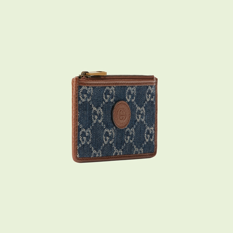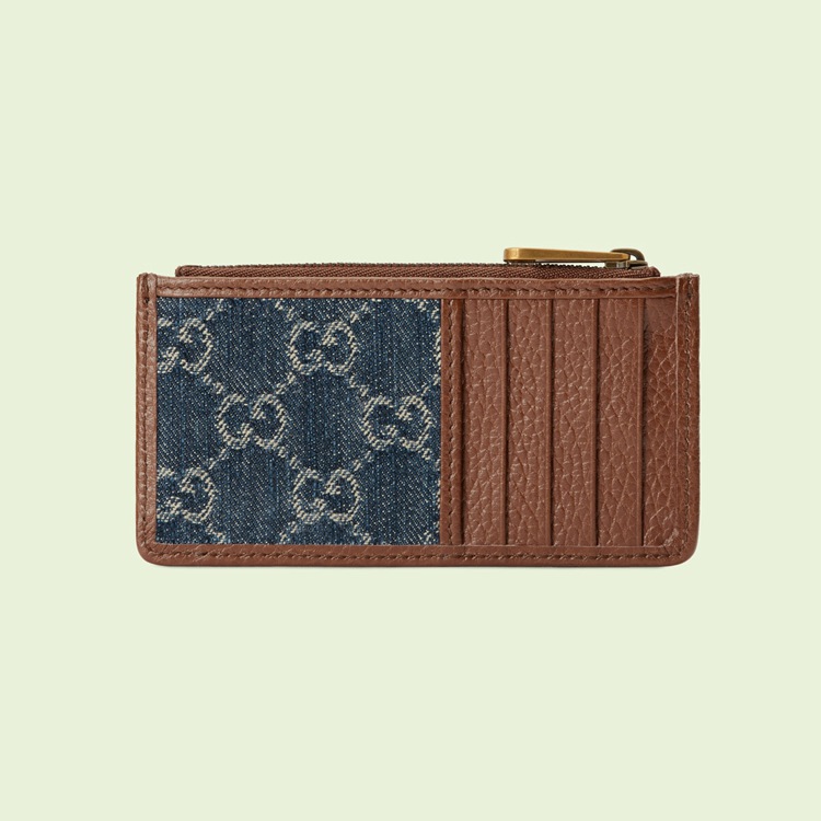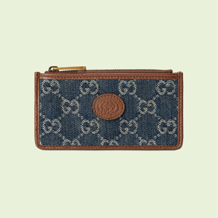 Style 697717 2KQGT 8375 A cult fabric, denim has become a staple throughout The Gucci universe. Reinterpreted through The Gucci lens, The material appears in different ways and moods throughout The latest collections, from ’70s-styled jeans to a selection of Retro accessories. Here, This card case is Crafted from blue and ivory denim With an allover monogram motif. Completing The ’90s logo feel, a leather Interlocking G tag completes The style.