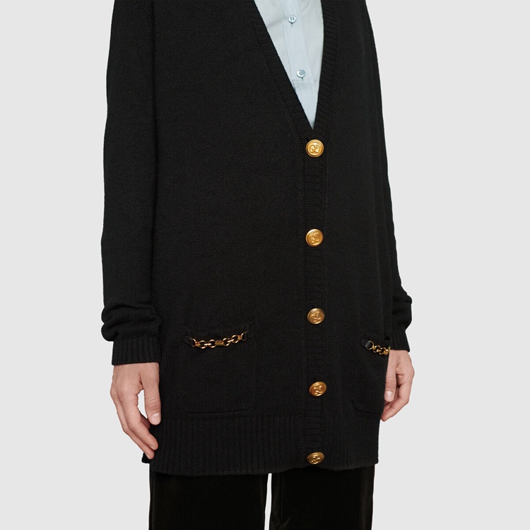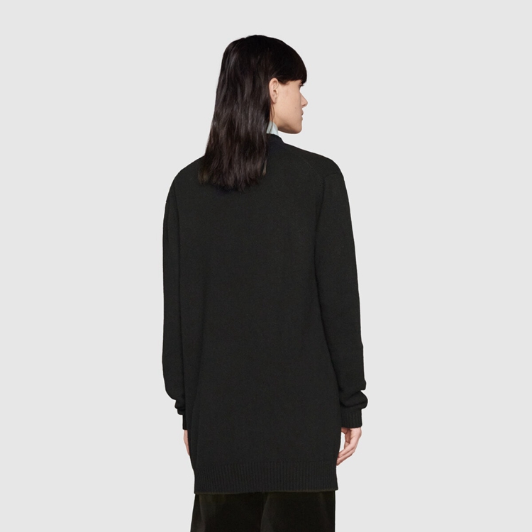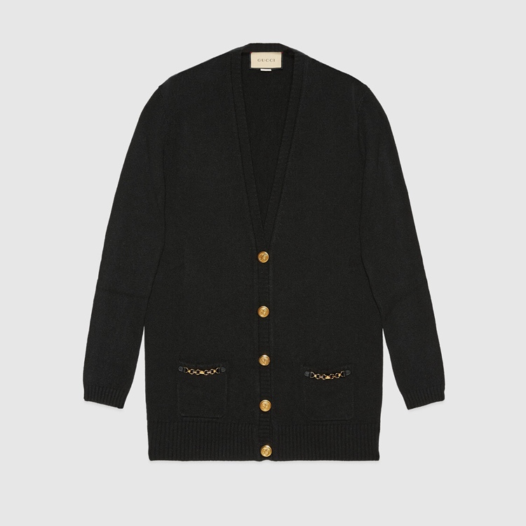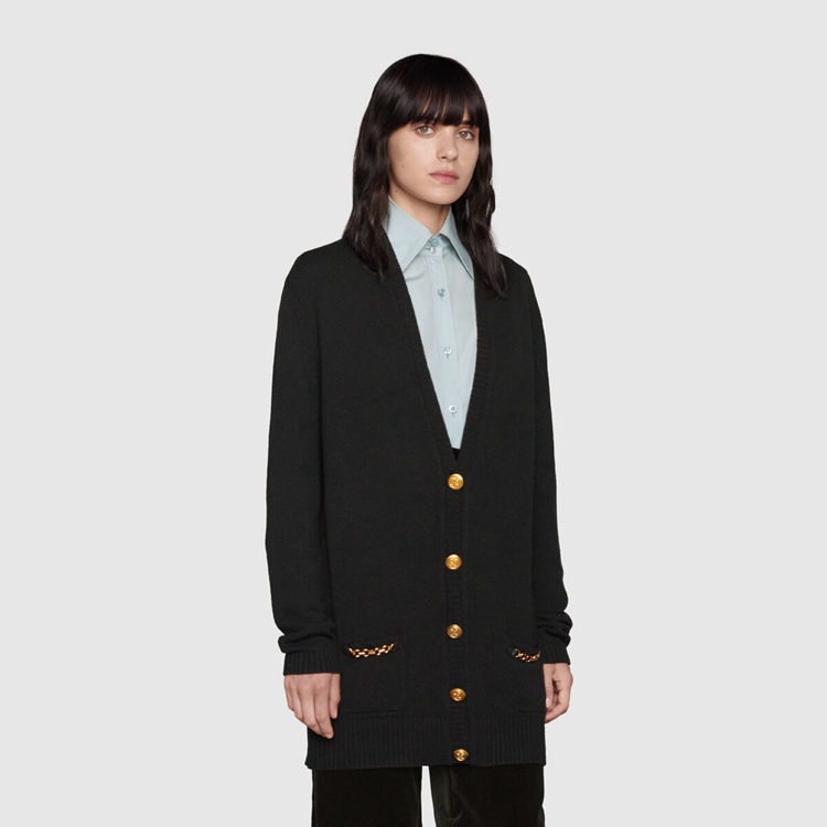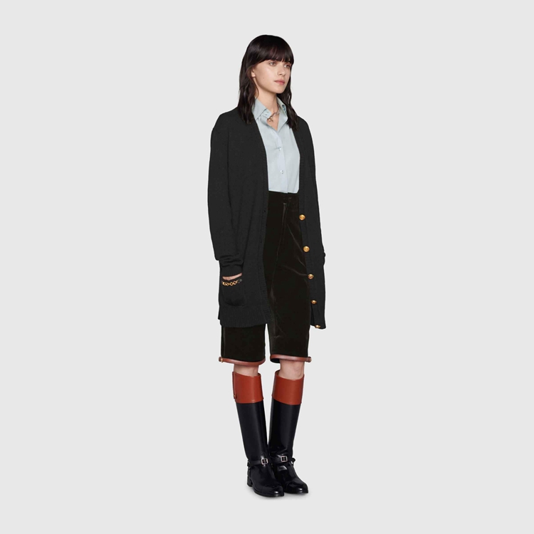 Style 678441 XKB1R 1043 Classic knitwear plays an essential role in reshaping The House’s streamline aesthetic, and traditional silhouettes are enriched by playful patches or Emblematic Gucci codes that speak to The brand’s heritage. This cashmere cardigan is completed With Interlocking G gold-toned buttons.
