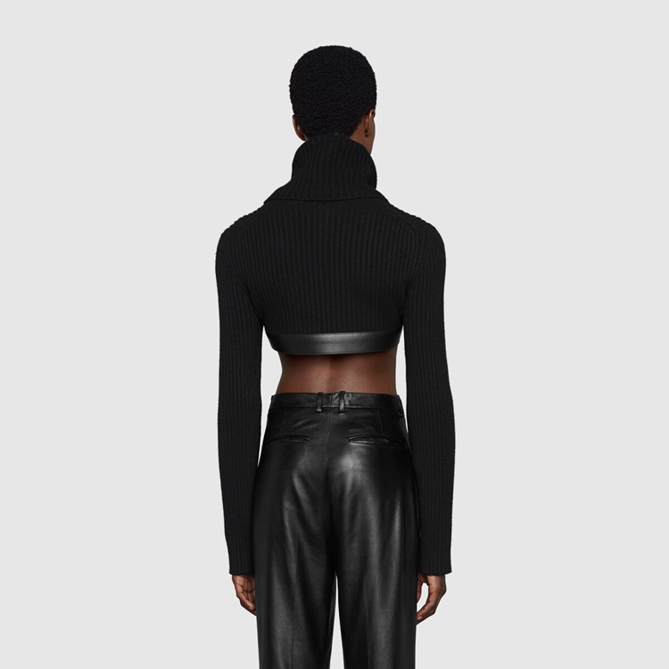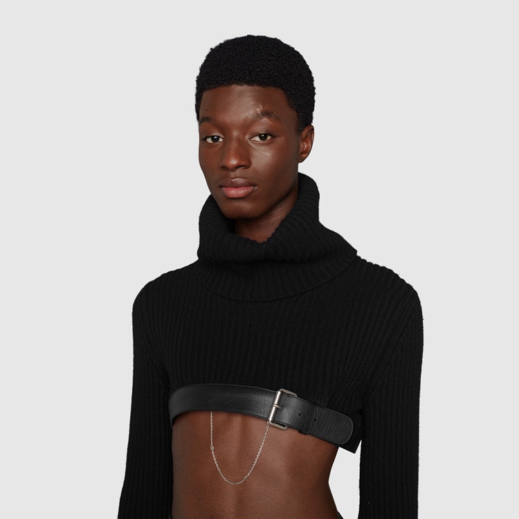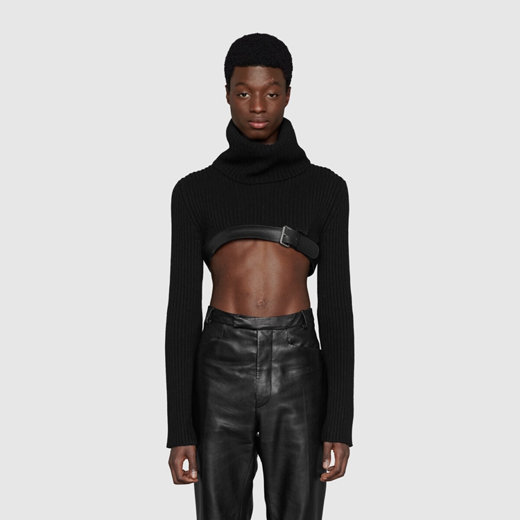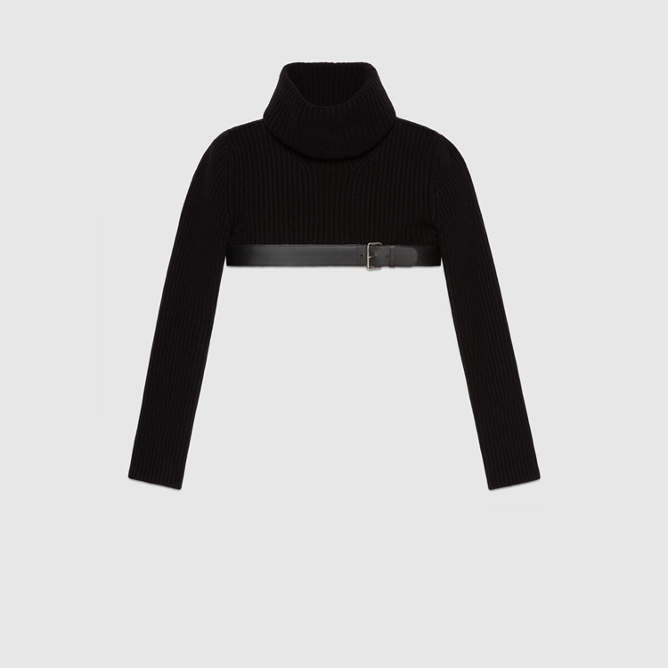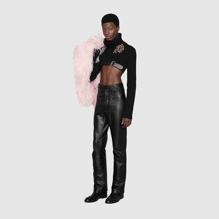Style 675558 XKB4M 1043 This season, For The first time, Alessandro Michele presents a series of completely black looks, The styles are composed of see-through or cropped Designs finished With unambiguous sensuality. Elements, such as straps and black leather pants, are juxtaposed by The outspoken femininity of ostrich feather vests and coats. This cropped turtleneck sweater is finished With a black leather trim With buckle.