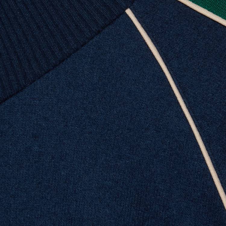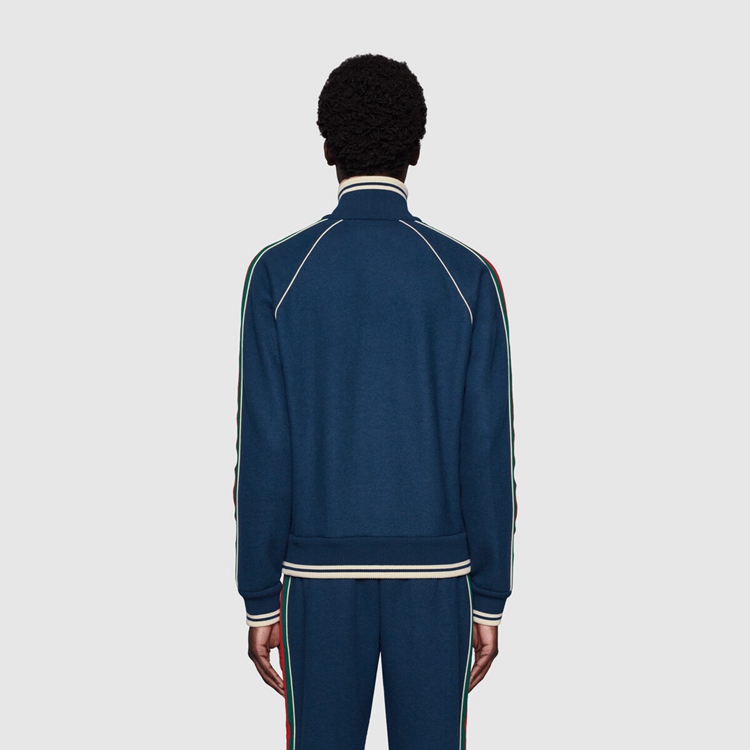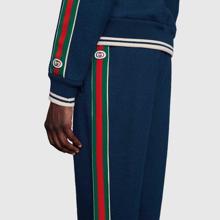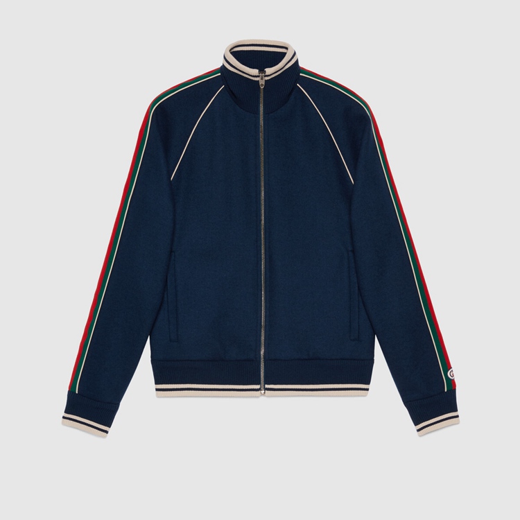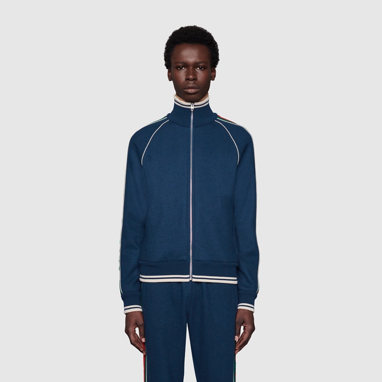 Style 645243 XJC58 4215 The worlds of knitwear and sportswear collide, resulting in a collection of styles that combine athletic Inspired features and classic, refined fabrics. This zip-up jacket With contrast piping and front pockets is Crafted from navy cashmere, and enriched by The green and red Interlocking G stripe down The sleeves—a detail reminiscent of vintage tracksuits.