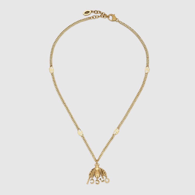 Style 679011 I6656 8097 The bee has become a signature symbol For The House. First seen in Gucci ready-to-wear in The 1970s, it continues to add a historical richness to every collection. Here it appears as a delicate pendant on This gold-toned metal chain necklace, featuring The Double G emblem.