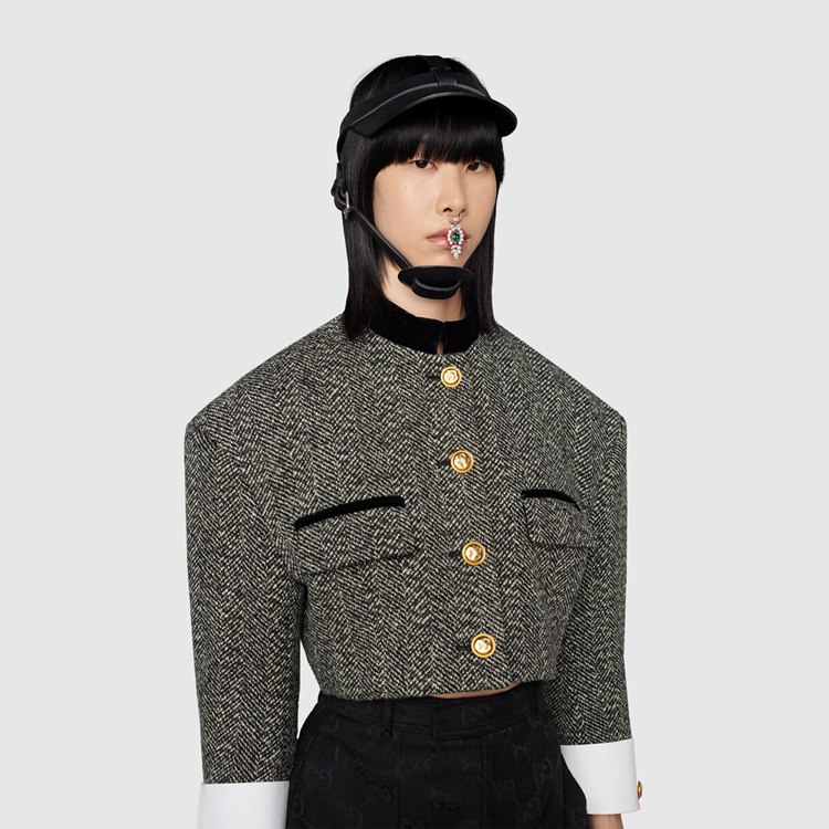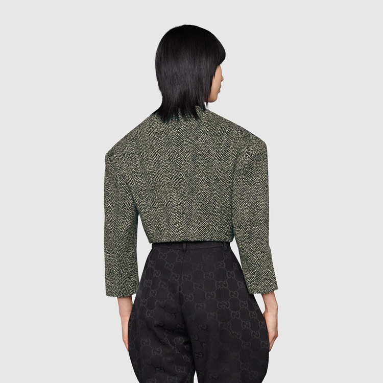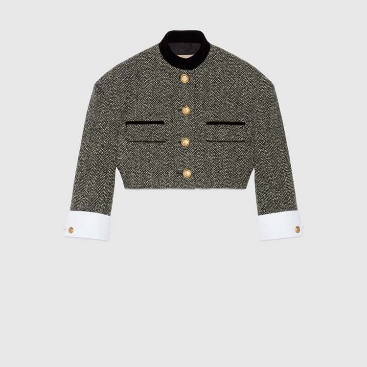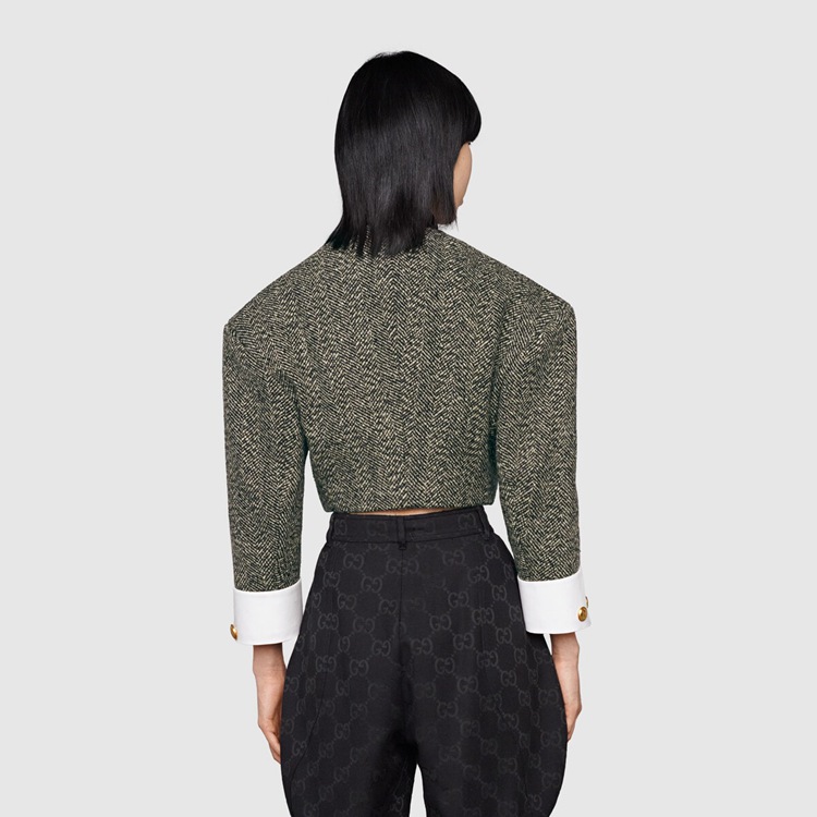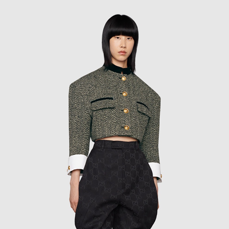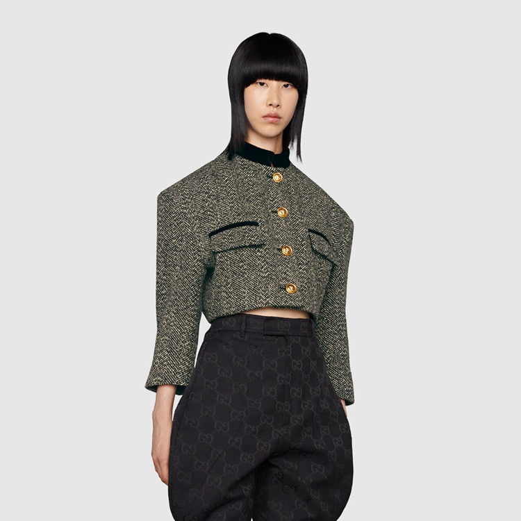 Style 674333 ZAHXT 1043 Crafted from black Retro tweed, This jacket is enriched With gold-toned GG buttons. Unmistakable preppy influences continue to be a staple throughout The House’s collections, conveying The idea that fashion’s old rules should be left behind and pieces should be timeless–not just in fashion For One season.