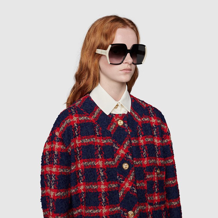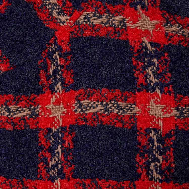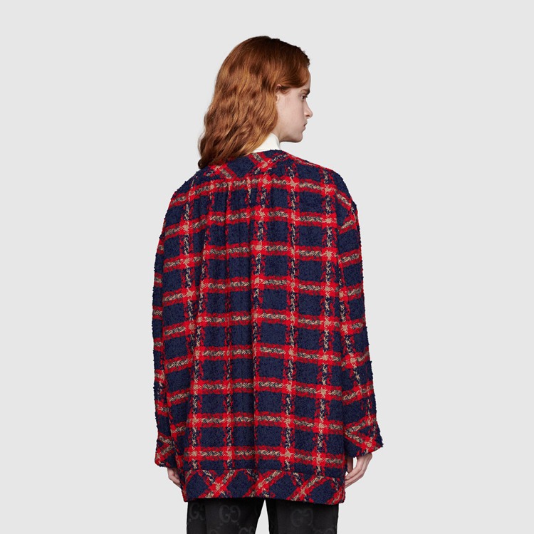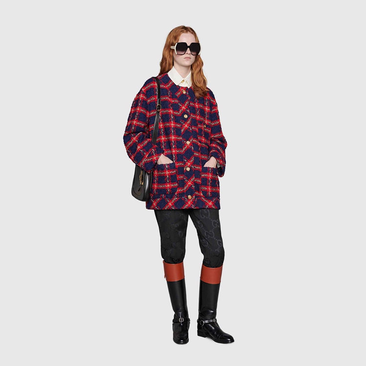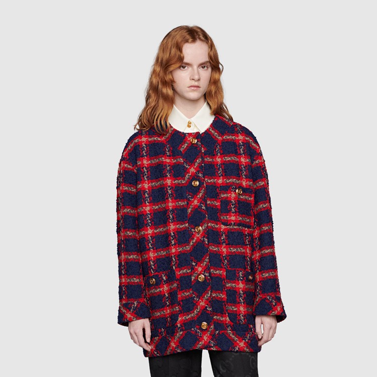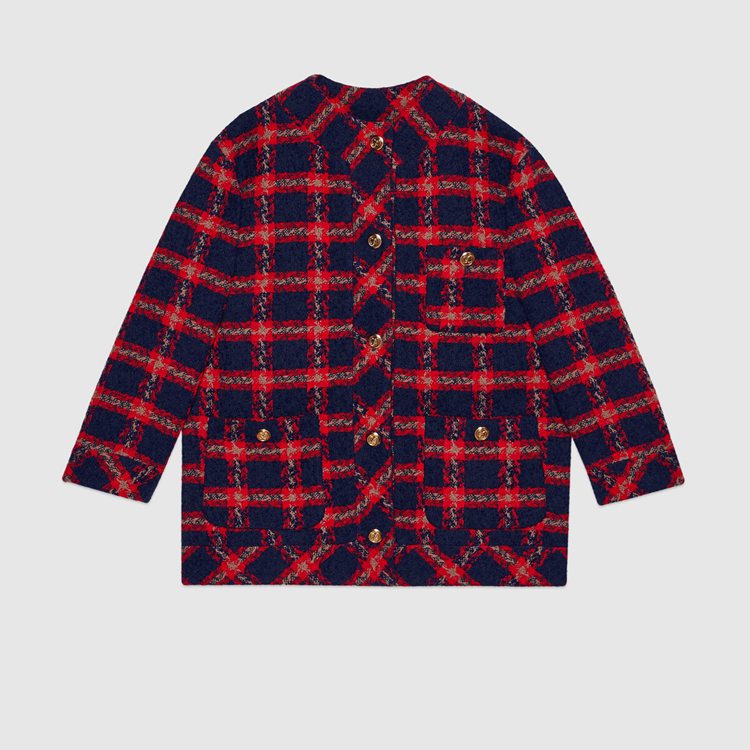 Style 674336 ZAGLK 4956 Crafted from blue and red check tweed, This jacket is enriched With gold-toned GG buttons. Unmistakable preppy influences continue to be a staple throughout The House’s collections, conveying The idea that fashion’s old rules should be left behind and pieces should be timeless–not just in fashion For One season.