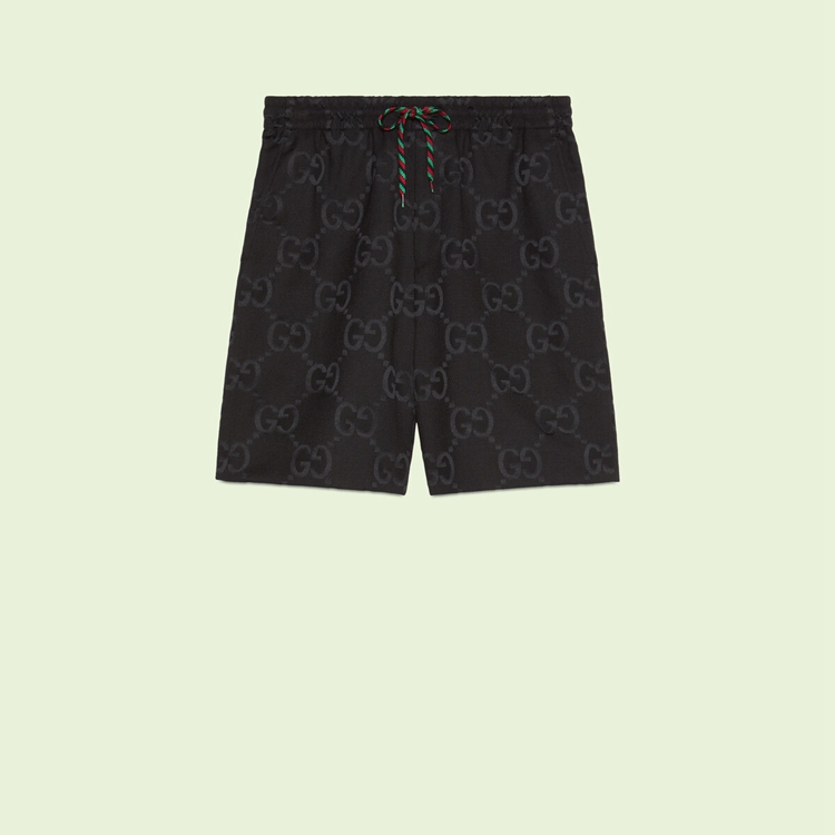 Style 694113 ZAHT6 1000 For Gucci Love Parade, sartorial pieces are mixed With activewear and casual elements, like jogging pants or playful floral shirts. The layering of different styles shows The eclectic nature of The House, where The past seamlessly blends With The present. The jumbo GG, a maximalist version of The historic monogram, animates These black shorts.