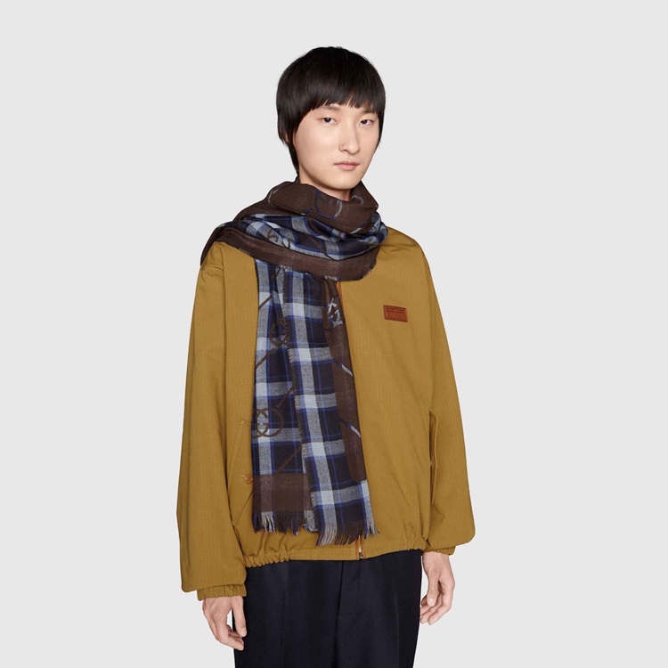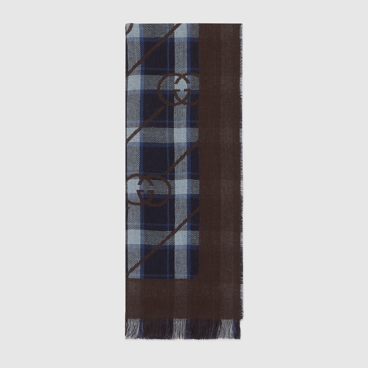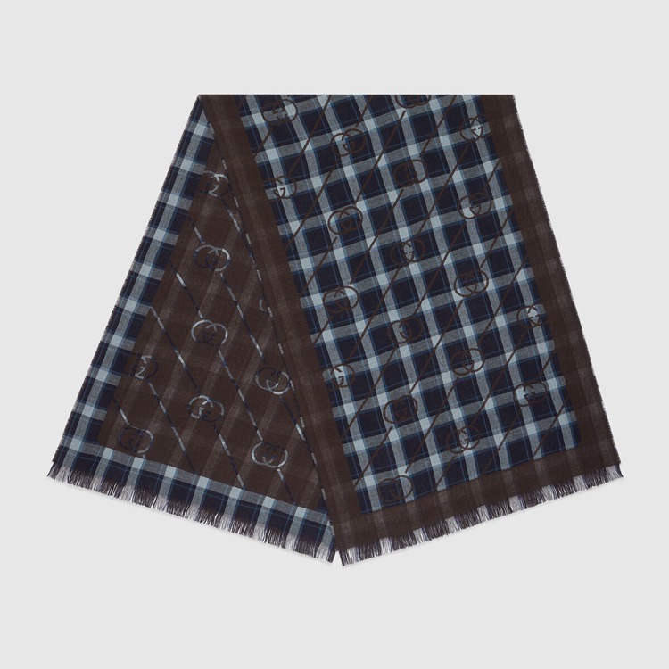 Style 660015 4GA41 2568Gaining notoriety in The 1960s, The Emblematic interlocking G logo is representative of Founder Guccio Gucci’s initials and has since been reintroduced in a variety of forms and interpretations. Here, The symbol decorates a blue and brown wool stole.