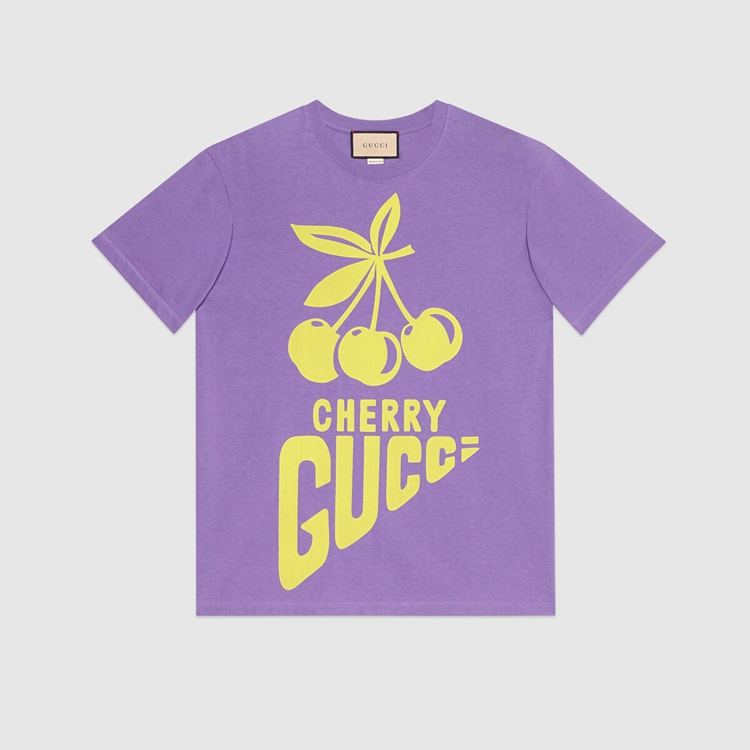 Style 615044 XJDZ3 5641 Part of The Gucci references to pop culture, fruits in all shapes and forms continues to enrich The House’s narrative. For Aria, they appear as playful prints, often enriching a selection of ready-to-wear pieces. This lilac cotton T-shirt is animated by a ‘Cherry Gucci’ print.
