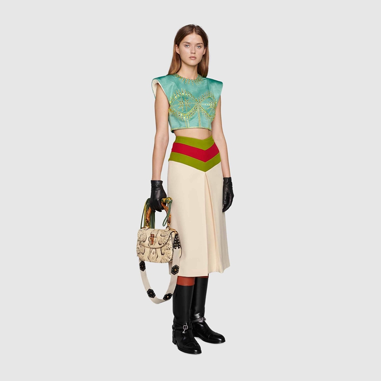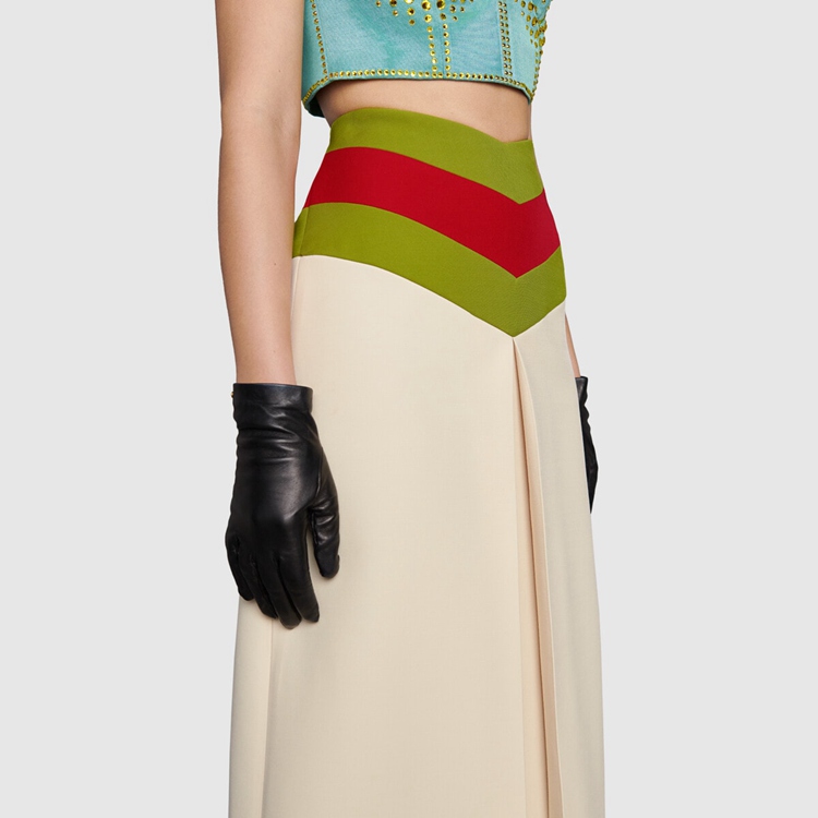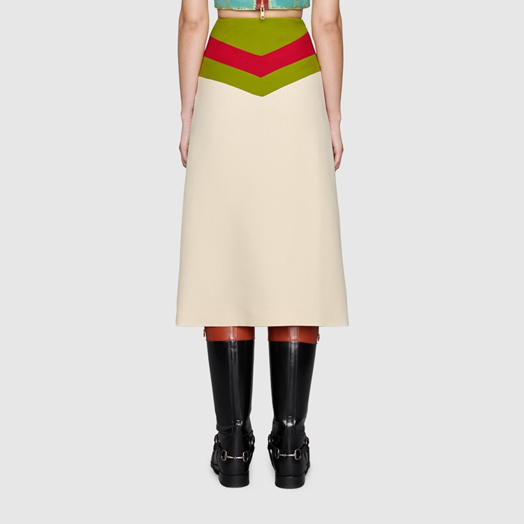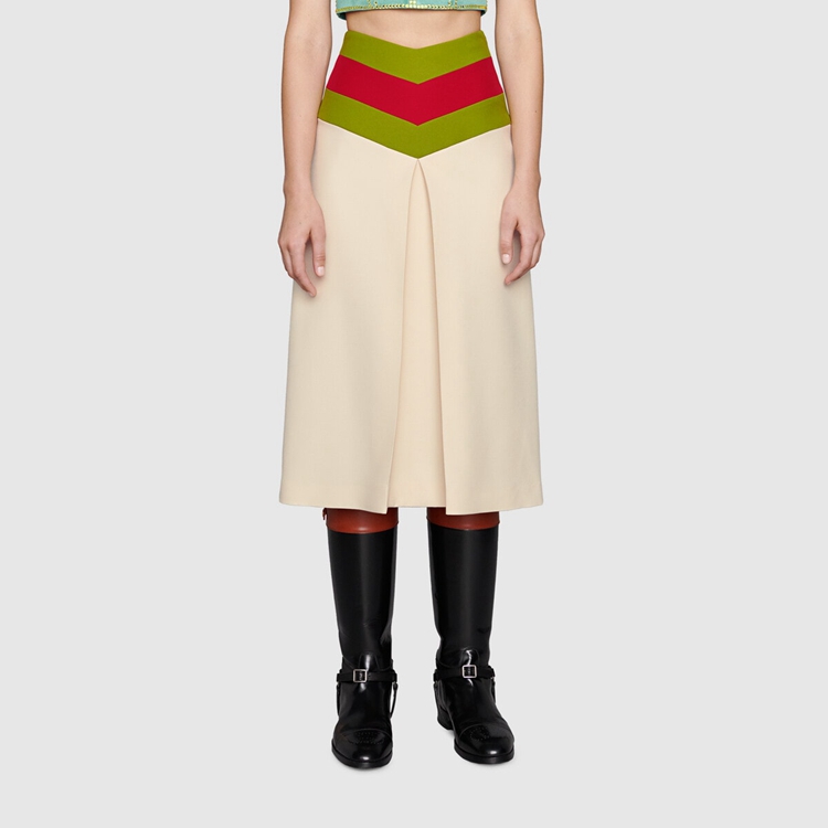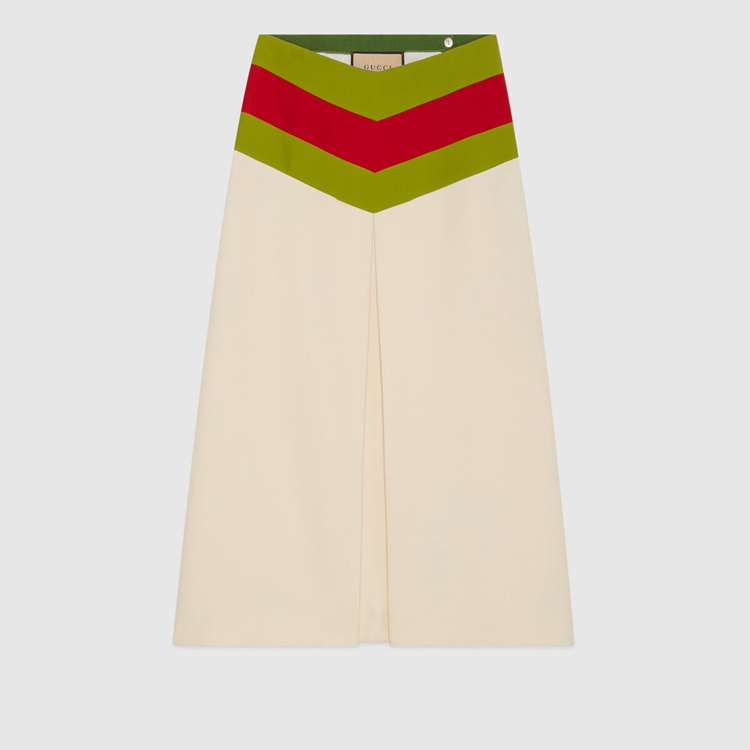Style 669707 ZAD88 9783 Details taken from The archive continue to be incorporated into The collections With contemporary take. The chevron vintage Web appears on The front of This skirt, Recalling The sportswear influences that run through The House’s narrative, while The pleated layers of The bottom Part add a refined touch.