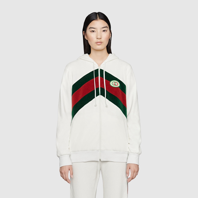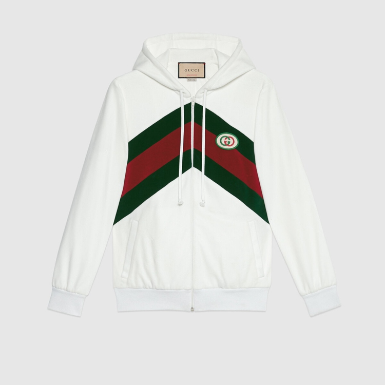 Style 678640 XJDYG 9061 Imbued With references to vintage sportswear, This cotton zip jacket embodies The preppy influence of The collection. Trimmed With a chenille green and red chevron Web on The front, The style is completed With an Interlocking G patch.