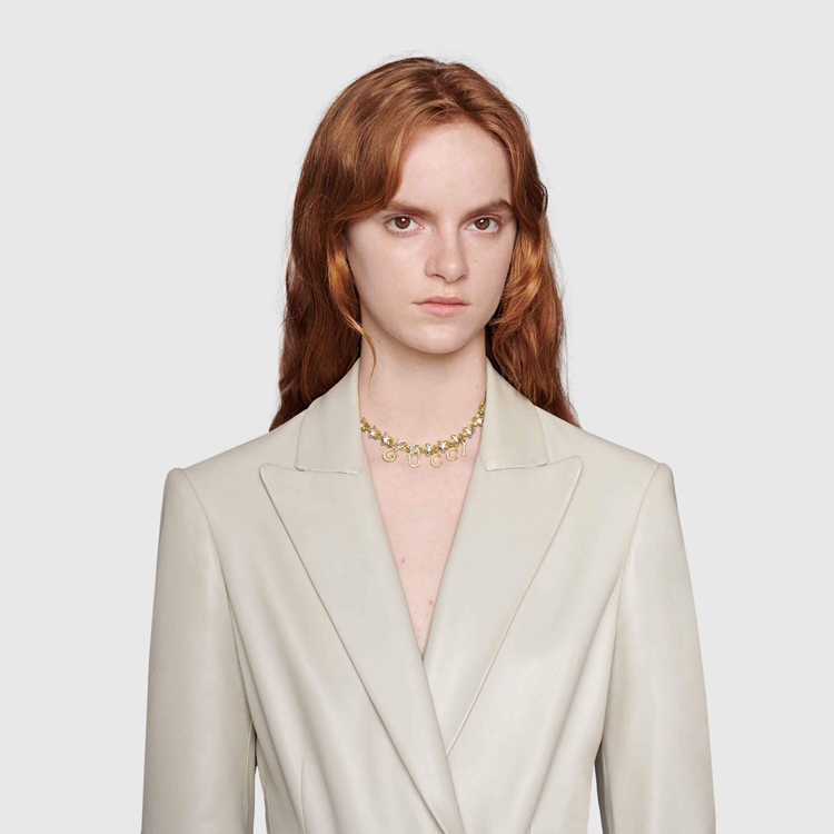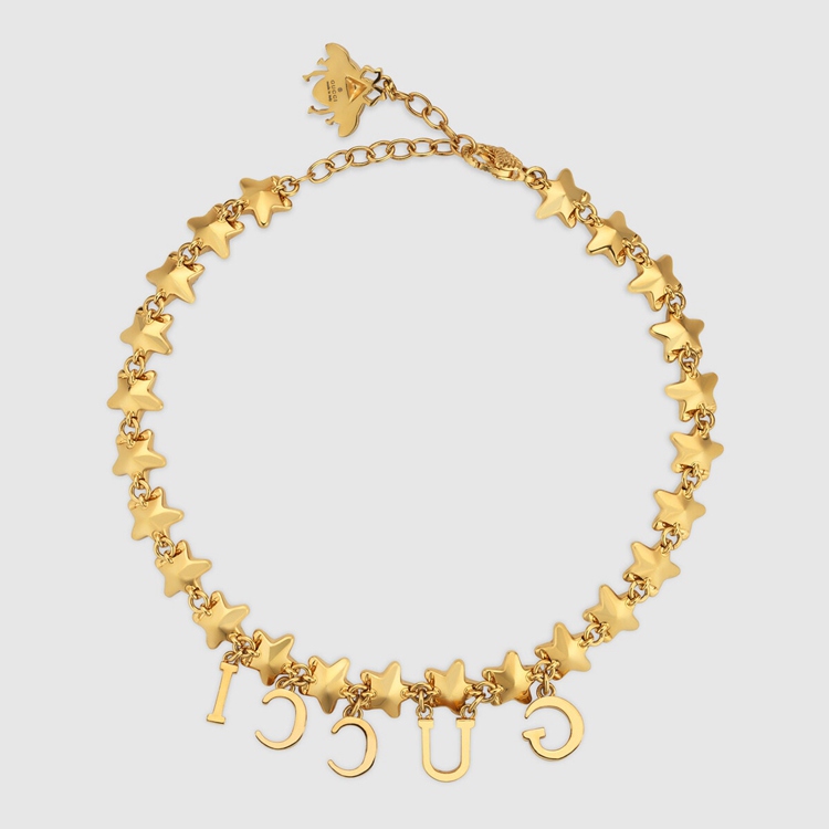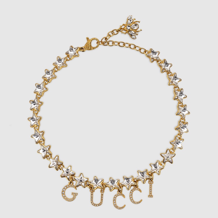 Style 675262 J1D50 8031Evoking a sense of fun, The Gucci script is The main focal point of This choker necklace Crafted from a gold finish. The style is enriched With sparkling crystals and stars For a touch of glamor.