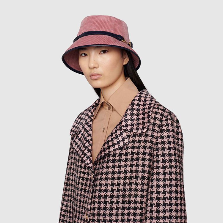 Style 679425 3HAFT 6368 This fedora hat, Crafted from pink corduroy velvet, is an example of The brands continual experimentation With materials in creative ways. The style is enriched further With leather details and Horsebit hardware. These equestrian references date back to The 1950s and nod to The House’s archives through a contemporary lens.