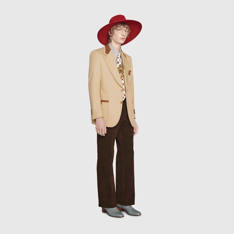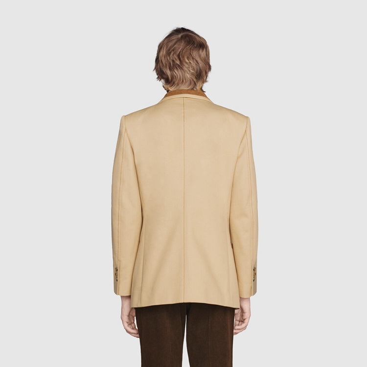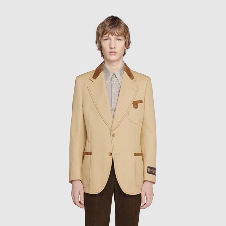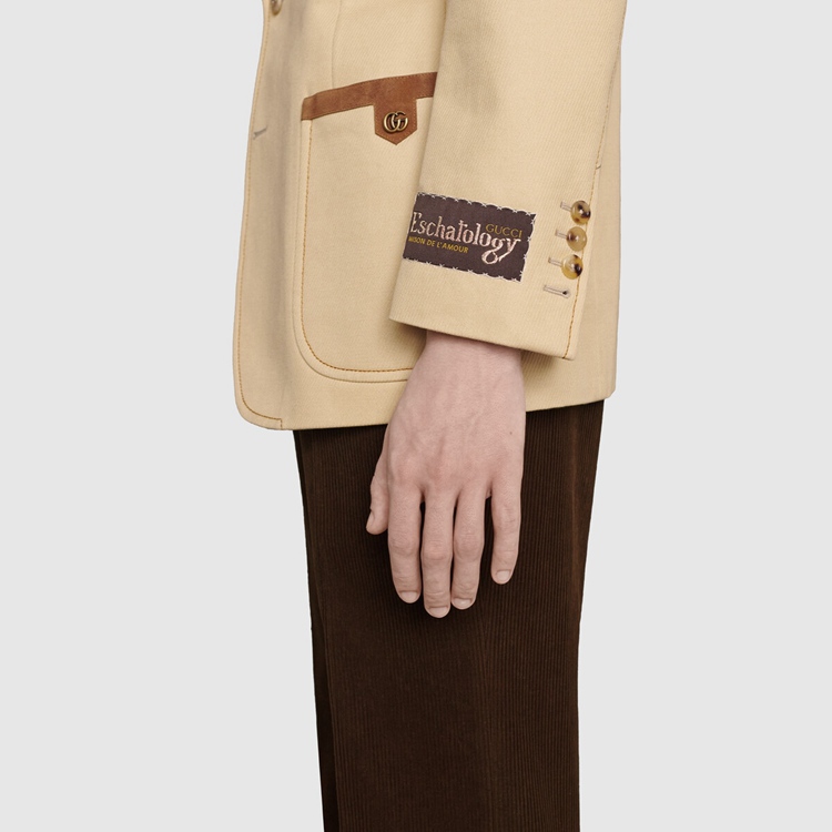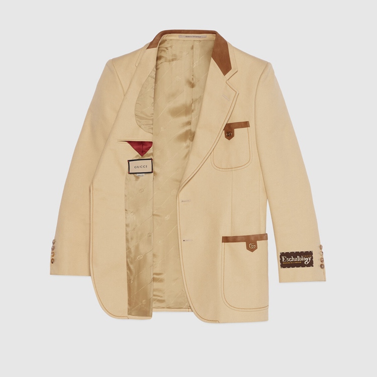 Style 654921 Z8AN7 9731 For Ouverture, The Creative Director continues to play With The idea of dressing Without rules—abandoning The rituals of seasonality to explore a New meaning of classic. This cotton tailored jacket has touches of leather and suede that add unexpected contrast to The silhouette. The Gucci Eschatology label adds another layer of detailing, Eschatology is in reference to a doctrine that explores The ultimate destiny of humans and The universe.