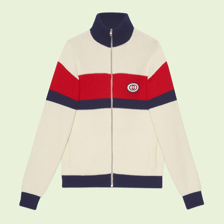 Style 692153 XKCA6 9171 This red, dark blue and ivory colorblock cotton bomber has a sporty feel With a zip-up front . An Interlocking G patch enriches The front reflecting The same colors.